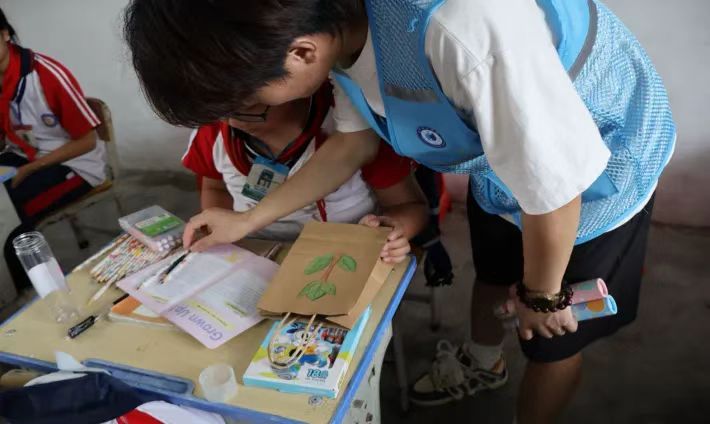 (实践团成员指导孩子们在牛皮纸袋上作画)