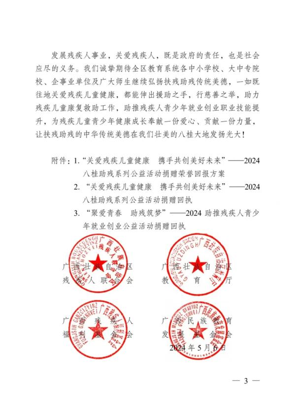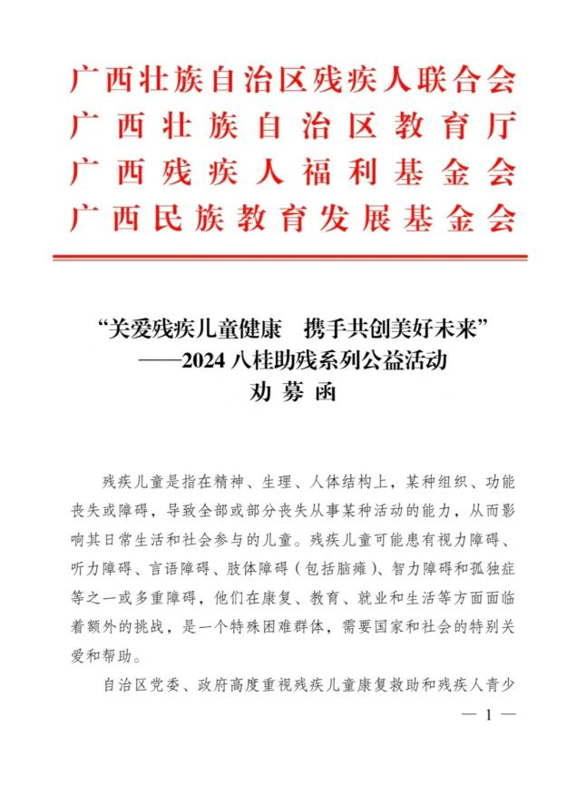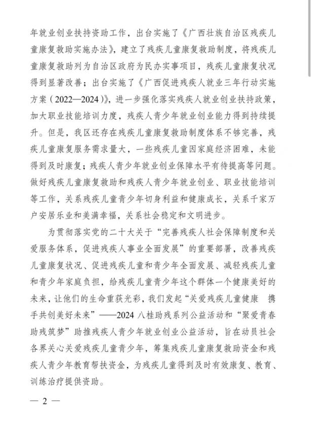 由自治区残联、自治区教育厅、广西残疾人福利基金会、广西民族教育发展基金会继续在全区教育系统开展“关爱残疾儿童健康 携手共创美好未来”——2024年八桂助残系列公益活动。