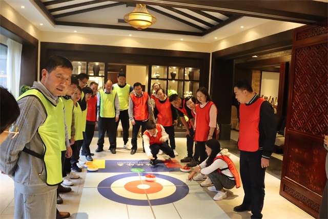 天公不作美,下起了雨,虽然活动场地由户外转移到了室内,但丝毫没有减弱学员们的参赛热情。活动正式开始前,教练员带领学员们结合才艺表演完成了轻松愉悦的互动游戏,使学员们的身体和心理得到一些放松。随后教练员组织两个队伍选出队长和队名,制作队旗、队歌,创造小队造型,并一一展示。野体扫描仪、不倒森林、我们都是最棒的、旱地冰壶等项目激起了学员们对自我的挑战,一起体验团队合作的快乐。虽然成绩有高有低,但大家都团结协作,奋勇争先,不气馁,不放弃,共同完成了体力和脑力的大比拼。