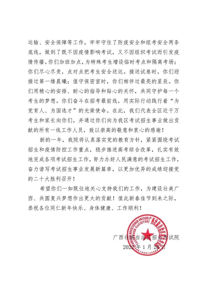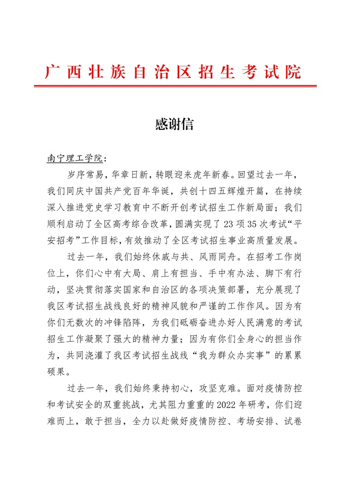 近日,广西壮族自治区招生考试院给我校发来感谢信,对我校的招考工作表示感谢。感谢信原文如下:
