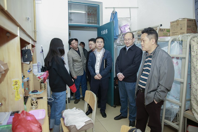 曾繁荣总会计师在我校领导的陪同下,实地查看了学生公寓、菜鸟驿站等区域。曾繁荣总会计师一边查看一边详细询问,并针对问题提出整改意见。