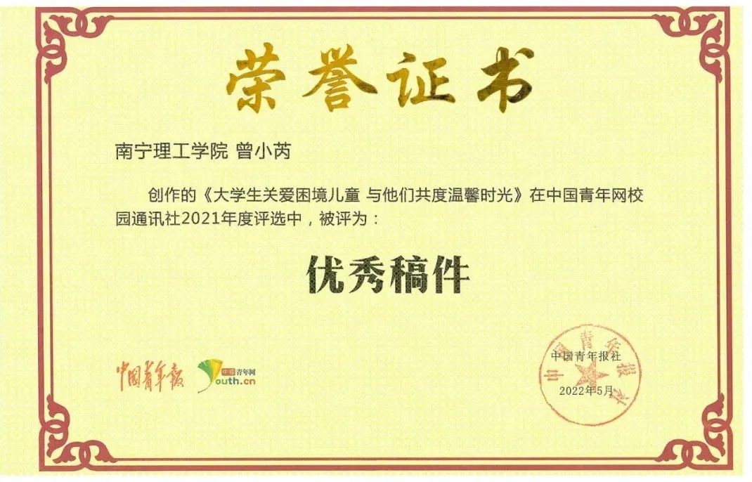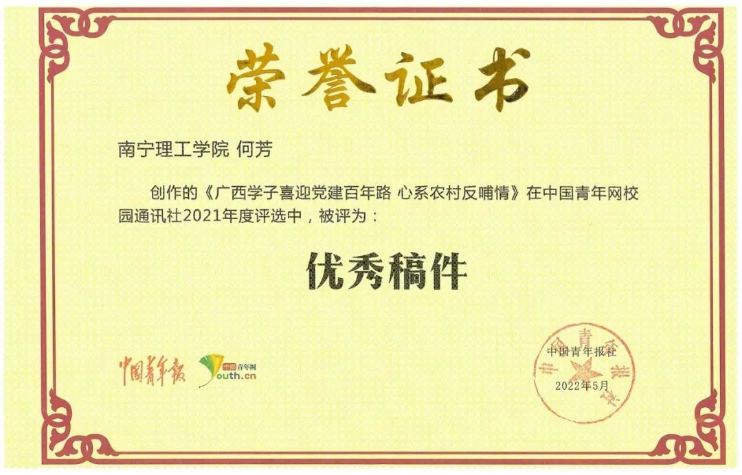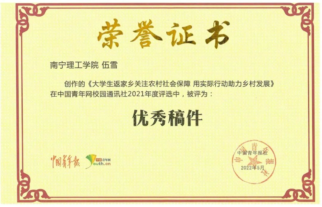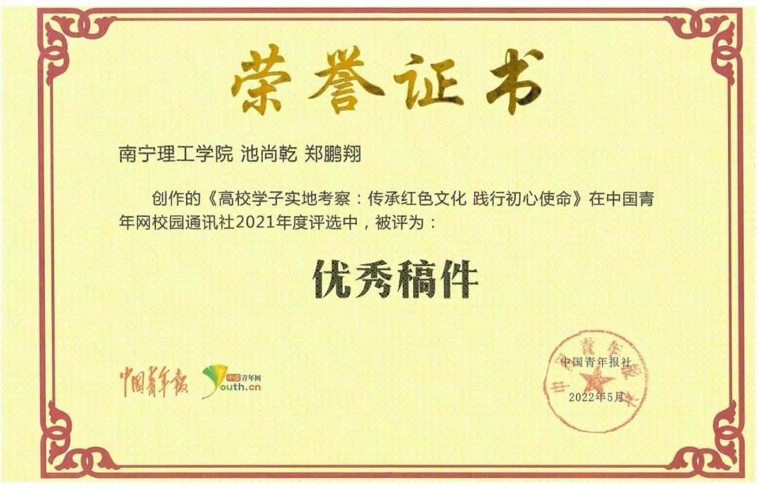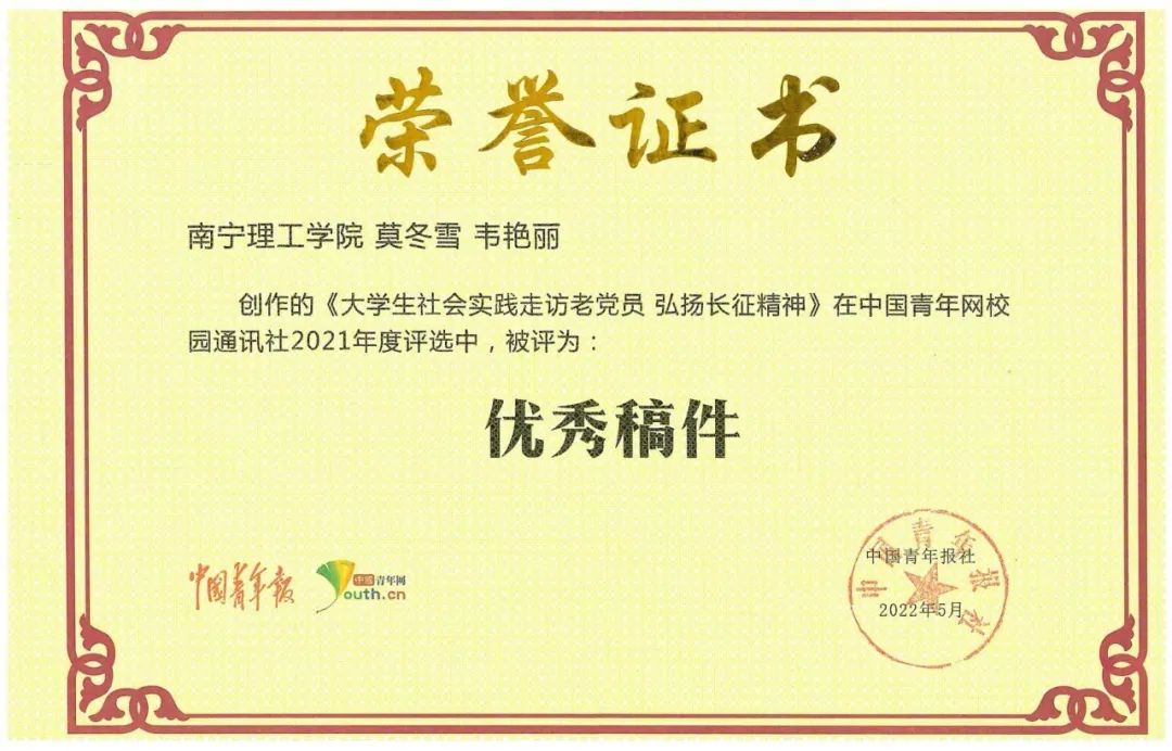 我校在此次评选活动中获评优秀通讯站,罗文俊老师获评优秀指导老师,黄欣、赵雅萱同学获评优秀通讯员,《大学生社会实践走访老党员 弘扬长征精神》《广西学子喜迎党建百年路 心系农村反哺情》《大学生返家乡关注农村社会保障 用实际行动助力乡村发展》《高校学子实地考察:传承红色文化 践行初心使命》《大学生关爱困境儿童 与他们共度温馨时光》获评优秀原创稿件。