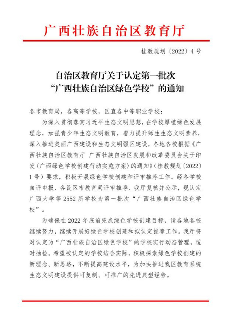 近日,自治区教育厅公布了第一批次获得“广西壮族自治区绿色学校”名单,我校成为首批荣获“广西壮族自治区绿色学校”称号的学校之一,这是我校扎实推进校园生态文明建设工作中取得的一项重要成果。