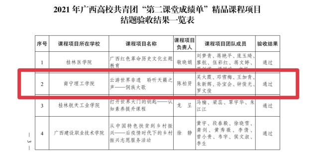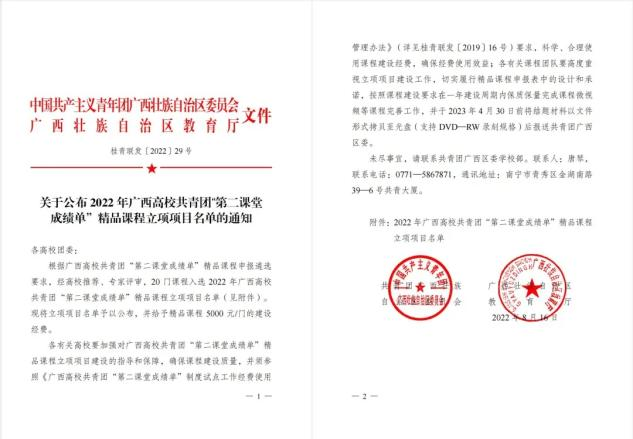 近日,共青团广西区委和自治区教育厅公布了《关于组织申报 2021年广西高校共青团“第二课堂成绩单”精品课程的通知》(桂青联发〔2021〕4 号)和《关于公布 2021 年广西高校共青团“第二课堂成绩单”精品课程立项项目名单的通知》(桂青联发〔2021〕10 号)。本次课程项目面向全区高校征集,申报课程近百项,经课程项目申请、组织评审,“广西红色革命历史文化主题教育”等 29 个课程项目通过验收。