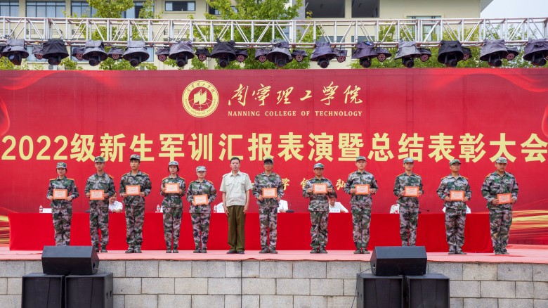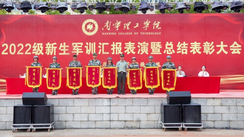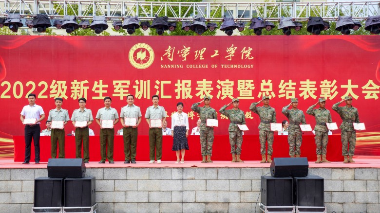 各方阵连队汇报表演结束后,学工处李枚晏宣读《关于表彰桂林雁山校区2022级新生军训先进集体和先进个人的决定》。出席本次大会的领导向优秀学员、优秀教官、优秀指导员和优秀连队分别颁发证书。