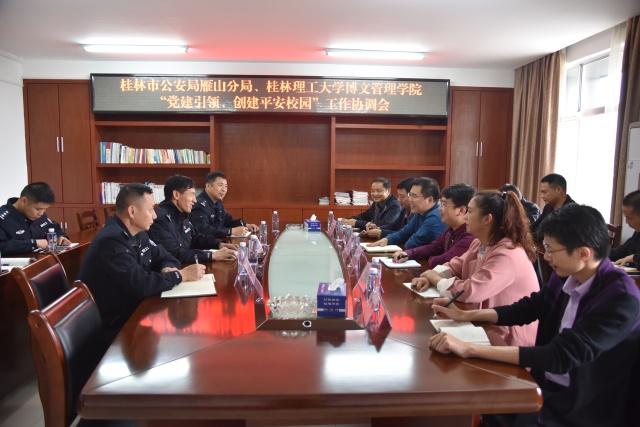 雁山分局领导与学校就平安校园创建、周边环境治理交换了意见,双方还就组建联合党支部,以党建+引领平安校园建设进行了研讨交流。