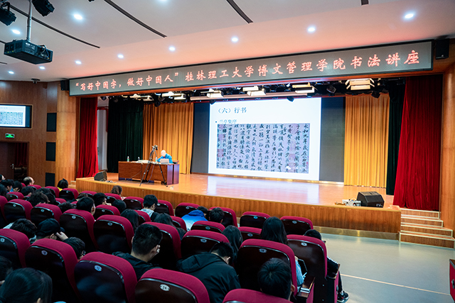 为传承传统文化,提升师生艺术修养,营造富有书香气息的校园文化氛围,11月20日下午,桂林南方书画院副院长张盛以“写好中国字、做好中国人”为主题,到我校为师生带来了一场精彩的书法知识专题讲座,400余名师生在报告厅聆听了讲座。