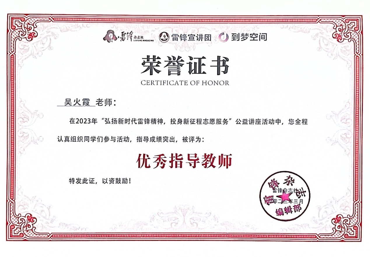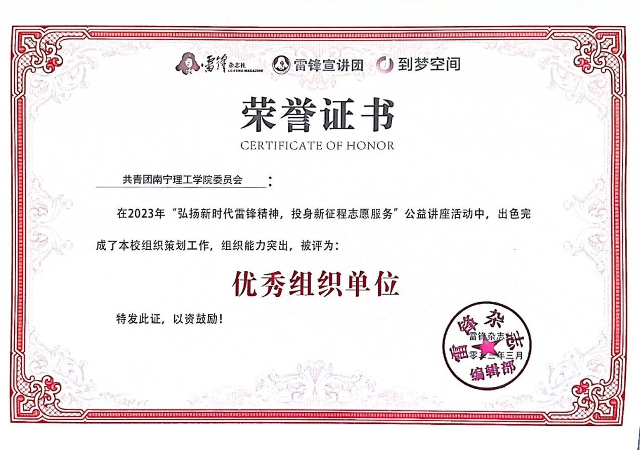 无论时代如何变迁,雷锋精神永不过时。南宁理工学院在2023年“弘扬新时代雷锋精神,投身新征程志愿服务”公益讲座活动荣获优秀组织单位,一师一生荣获优秀指导教师和优秀组织者。