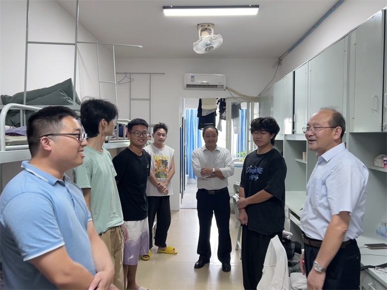 校领导们走进学生宿舍,向同学们表达了学校的关心与问候。在仔细检查宿舍的生活设施配置后,与同学们亲切交谈,询问空调制冷效果如何,食堂饭菜是否合胃口,是否适应大学集体生活,对未来四年有什么规划等等。同时强调了安全问题,尤其提醒同学们要防范电信网络诈骗,时刻保持警惕;鼓励同学们要立大志、明大德、成大才、担大任,希望同学们能够为大学四年交上满意的答卷。