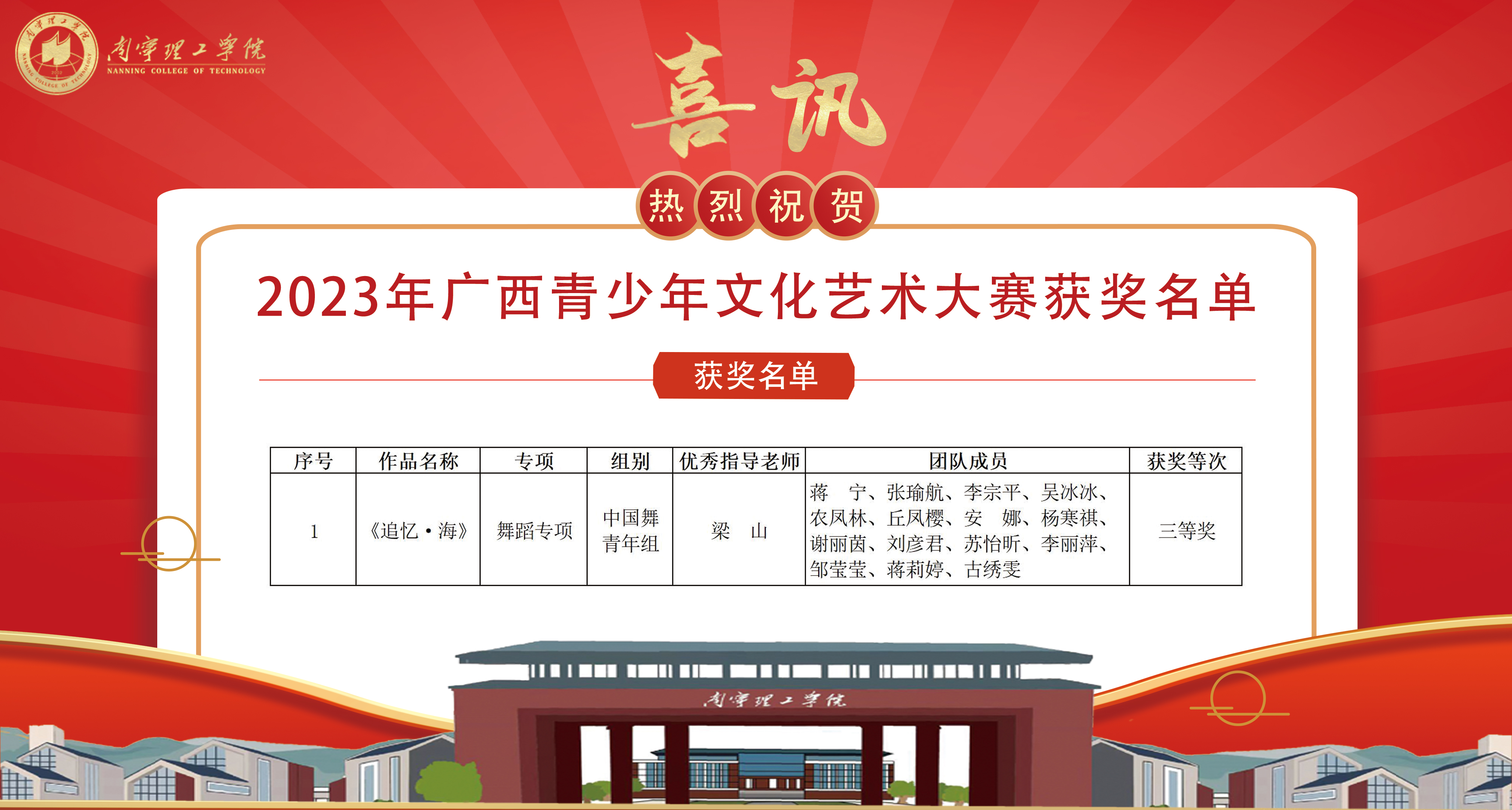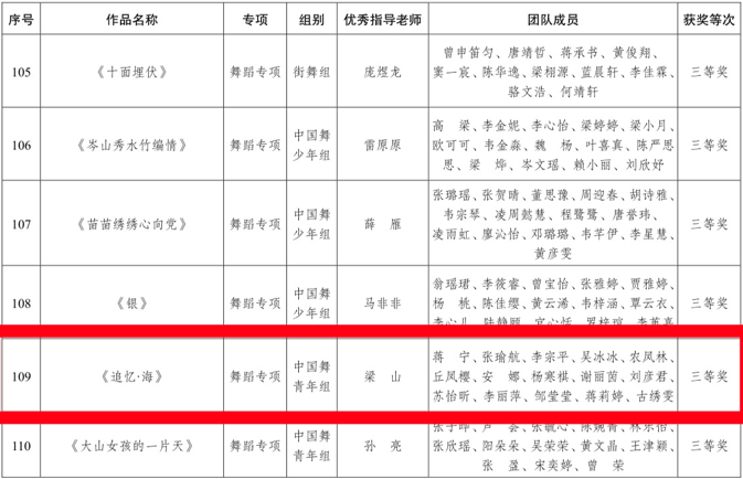 为深入学习党的二十大精神,落实习近平总书记对广西“五个更大”重要要求,共青团广西区委、自治区教育厅、自治区文化和旅游厅、自治区文学艺术界联合会、广西青年联合会、广西少工委联合主办了2023年广西青少年文化艺术大赛。自大赛开始以来,收到了近9000件作品,经过初赛、决赛以及录取程序等共评选出优秀作品210件、优秀指导老师90人。由我校梁山老师指导的舞蹈《追忆·海》荣获三等奖,在众多参赛作品中脱颖而出。