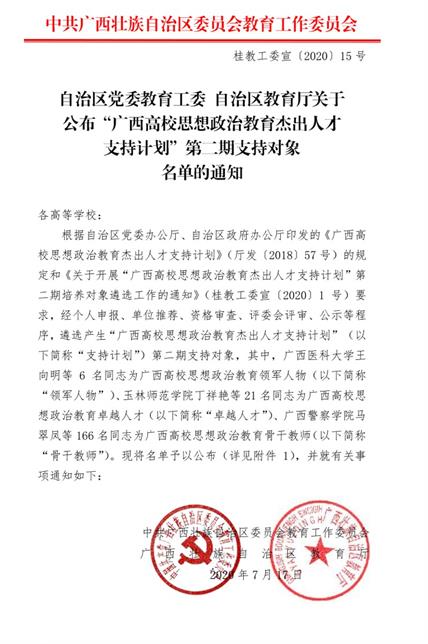 近日,自治区党委教育工委、自治区教育厅公布“广西高校思想政治教育杰出人才支持计划”第二期支持对象名单,我校老师入选“广西高校思想政治教育骨干教师”。