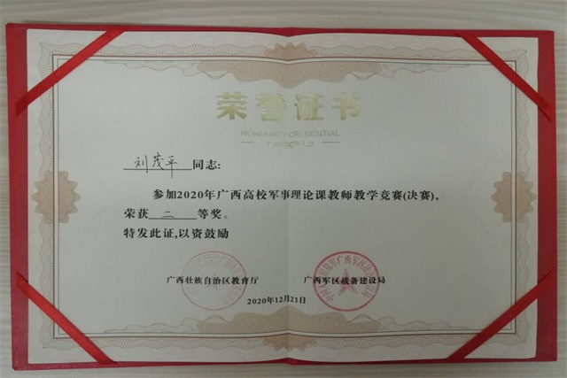 由自治区教育厅、广西军区战备建设局联合举办的全区高校军事理论课教学竞赛近日落下帷幕,我校老师经过激烈角逐,最终荣获二等奖。