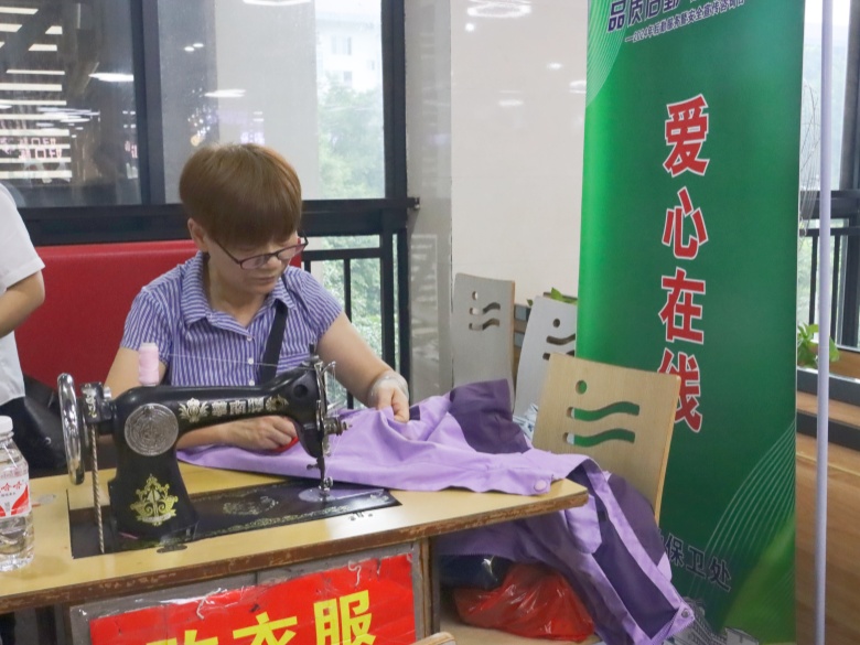 活动现场,专门为同学们提供免费缝补衣物的服务。平时为同学们服务的宿管阿姨们还专门准备好缝纫机、针线包,为有需要的师生缝补衣物。一张普普通通的桌子,几个简单的针线包,让同学们在学校也能感受到家的温暖。