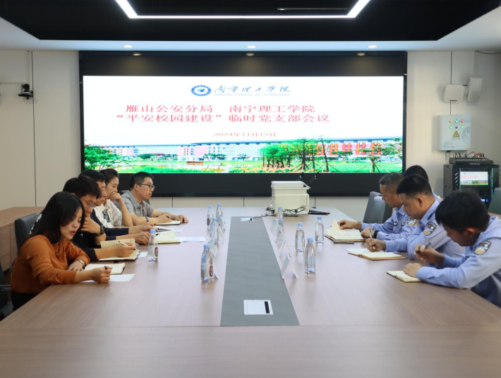 为加强大学生安全教育,完善警校共建机制,扎实推进我校平安校园建设,11月12日下午,桂林市公安局雁山分局副局长莫继淞、雁山派出所副所长陶绍碧、警务联络官蒋金石等一行4人到我校桂林雁山校区联合召开“平安校园建设”临时党支部会议。学校后勤保卫处、学生工作处(部)、土木与工程学院、信息工程学院等部门负责人参加会议。会议由后勤保卫处副处长温怡主持。