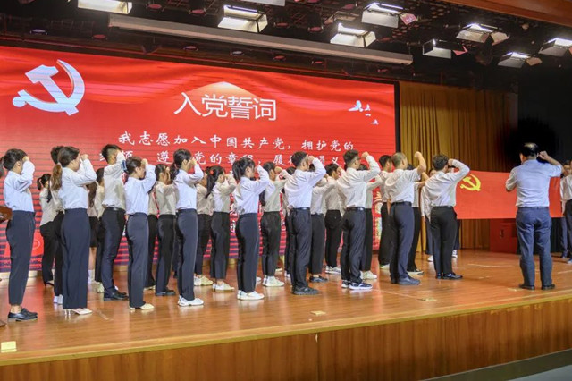 在雄壮激昂的国歌声中,大会拉开帷幕。随后,全体参会党员在金飞书记的带领下,举起右拳庄严宣誓。在这个特殊而隆重的场合上,新党员宣誓铿锵有力,老党员重温入党誓词感慨满怀。