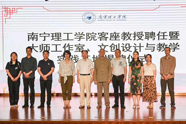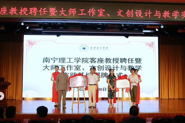 董事长尹少华代表学校给三位工艺美术大师邱广初、邱燕珍、吴幼明颁发客座教授聘任证书,并与副校长杨鲜丽、邱广初大师、邱燕珍大师一同为“广西工艺美术大师工作室”和校企合作“文创设计与教学实践基地”揭牌。