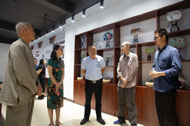 揭牌仪式后,受聘客座教授和嘉宾一同参观了建设与设计学院团扇工作室、中国结艺工作室,就工作室建设和产、学、研合作进行了深入探谈和交流。