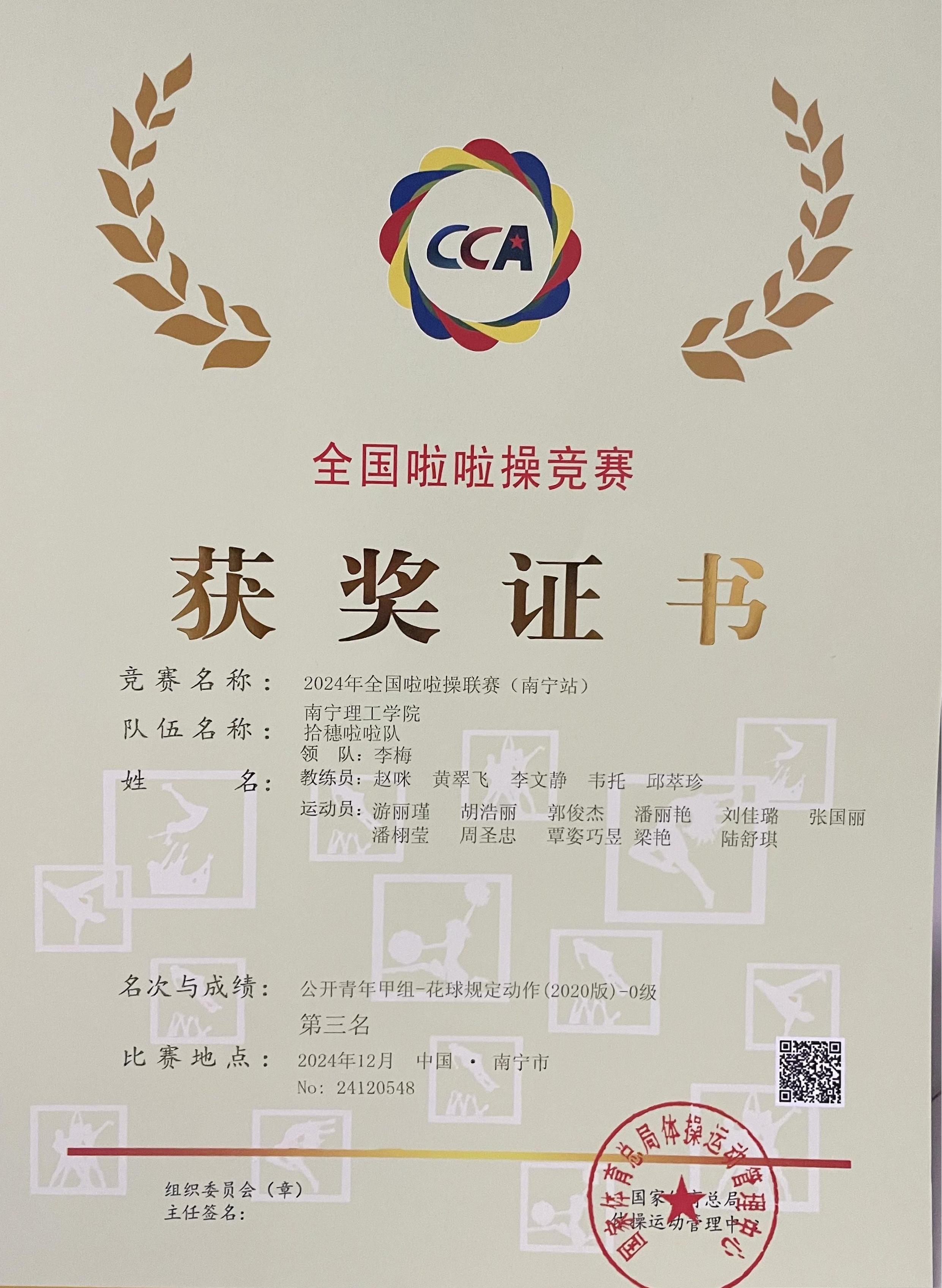 在学校文理学院体育教研室李梅、赵咪、黄翠飞三位老师悉心指导下,由学校社会体育指导与管理专业24名学生组成的运动队在2024年全国啦啦操联赛(南宁站)比赛中表现出色,斩获公开青年甲组集体街舞校园啦啦操示范套路(第三套)第一名、公开青年甲组街舞规定动作(2020版)-0级第一名、公开青年甲组花球规定动作(2020版)-0级第三名的佳绩。