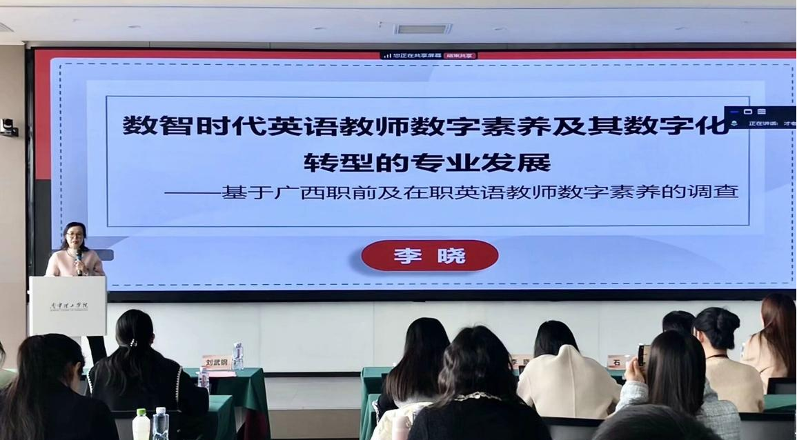 随后,广西高校外语教学指导委员会主任委员、南宁师范大学李晓教授带来了题为《数智时代英语教师数字素养及其数字化转型的专业发展——基于广西职前及在职英语教师数字素养的调查》的主题发言。李晓教授从新时代教师要求、国际视角以及调研结果等多个方面,深入剖析了当前高校英语教师数字素养的现状与问题,并提出了专业发展思考。她指出,数字素养是高校教师必备素质之一,应大力推动数字化教学平台与实践性精准培训的结合,将数字素养提升赋能教学与科研。同时,李晓教授也强调了数字技术是作为工具来赋能教育和学生,而非盲目跟风或落入数字教学陷阱。