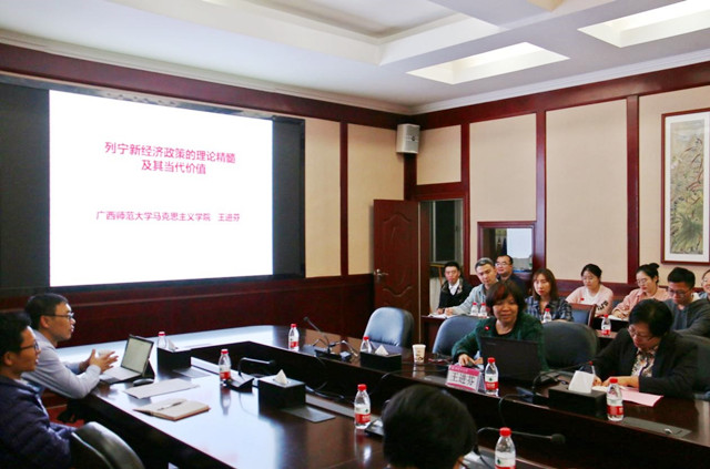 为营造良好的学术创新氛围,进一步提高我校思政课教师的学术研究能力和水平,10月27日晚,我校思想政治理论课教学部翟婧伟、王明成、杨晨光、解晶童、于恩洋5位老师参加了由桂林理工大学马克思主义学院举办的“列宁新经济政策的理论精髓及其当代价值”的专题讲座。讲座于屏风校区教八楼三楼会议室举行,由桂林理工大学马克思主义学院院长梁英主持,广西师范大学博士生导师王进芬教授主讲。
