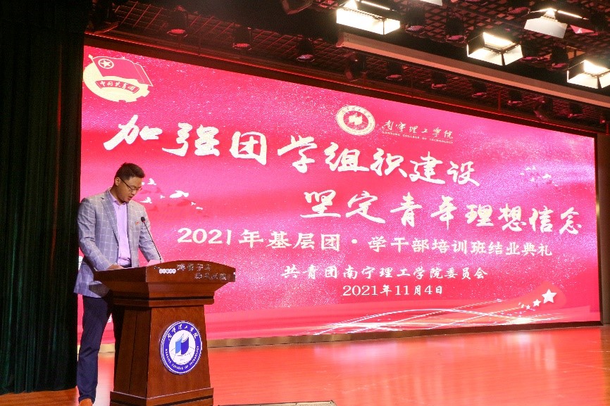 11月4日中午,我校于1626报告厅举行的南宁理工学院“加强团学组织建设 坚定青年理想信念”2021年团、学干部培训班活动结业典礼圆满落幕。校团委书记朱新辉,土木与工程学院分团委书记徐远菁,艺术与传媒学院分团委书记周健,信息工程学院分团委书记王辉,文理学院分团委书记王帅,团委老师纪雯娜,校团委学生副书记,各二级学院分团委学生副书记、组织部部长,2021年基层团、学干部培训班学员参加了结业仪式。大会由覃学鹏老师主持。
