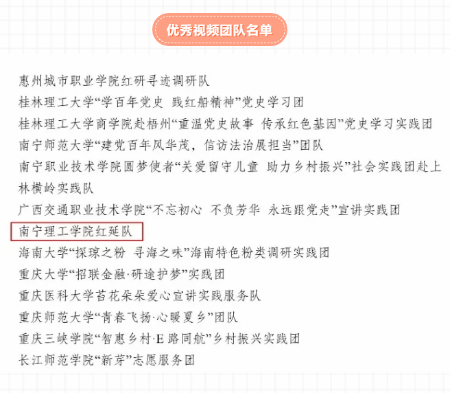 本次活动共有2028所院校3.7万支团队报送作品,1282所院校1.64万支团队进入投票评审环节,最终获奖数量为200个优秀单位、200支优秀报道团队、200支优秀摄影团队、200支优秀视频团队、192名优秀指导教师、189名优秀通讯员。经报名审核、作品发布、网络展示、综合评审等环节,其中我院南理红延队成功入选为优秀视频团队。