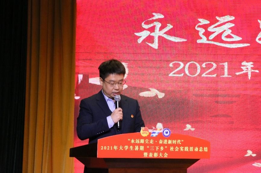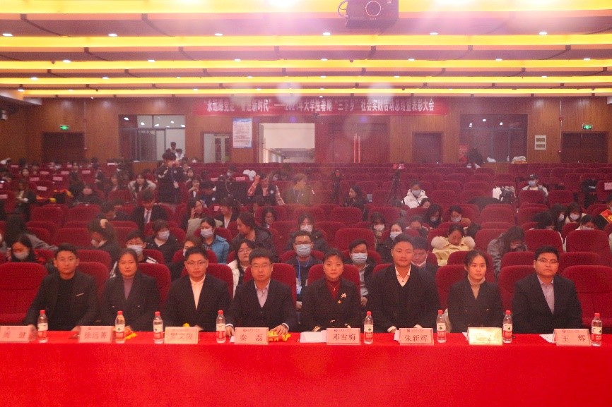 为了引导和帮助我校广大青年学生在社会课堂中受教育、长才干、做贡献,在实践观察中学党史、强信念、跟党走,12月17日上午我校于1626报告厅举行2021年大学生暑期“三下乡”社会实践活动总结暨表彰大会。出席成员有校党委副书记邓雪梅,团委书记朱新辉,土木与工程学院党总支书记秦磊,学生资助管理中心主任赵雯君,学校学生管理科科长罗文俊,土木与工程学院分团委书记徐远菁,艺术与传媒学院分团委书记周健,信息工程学院分团委书记王辉,校团委老师纪雯娜,以及全体辅导员、班主任以及各学院学生代表。会议由校团委老师覃学鹏主持。