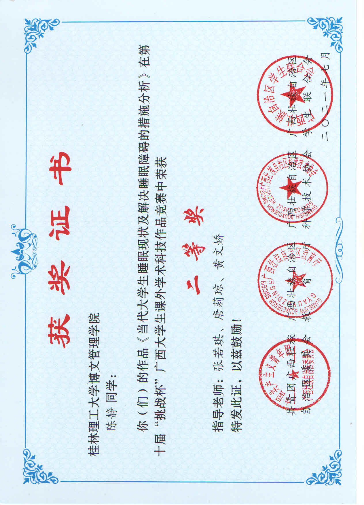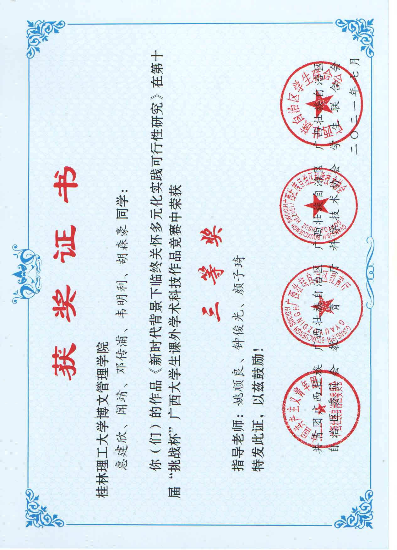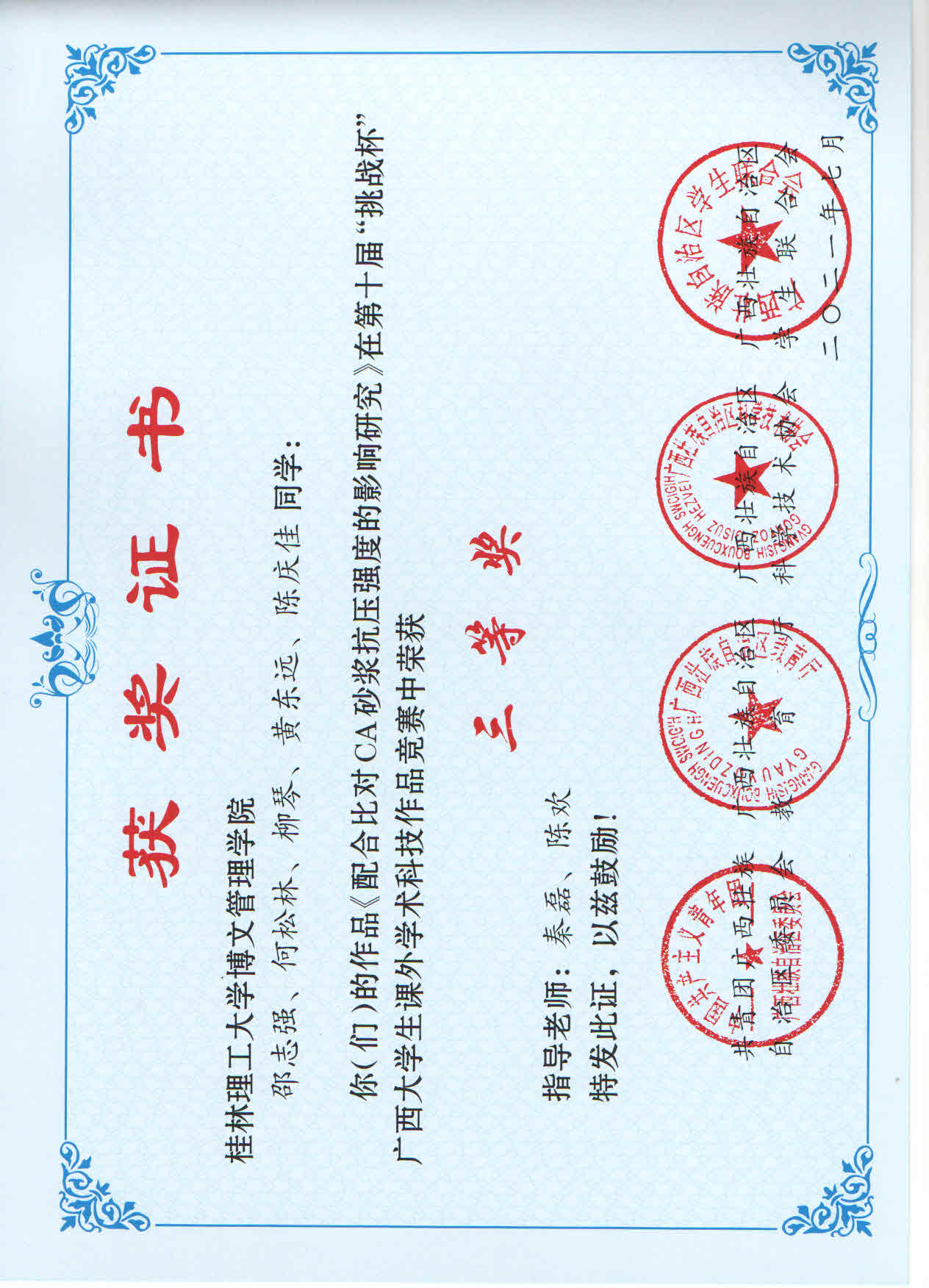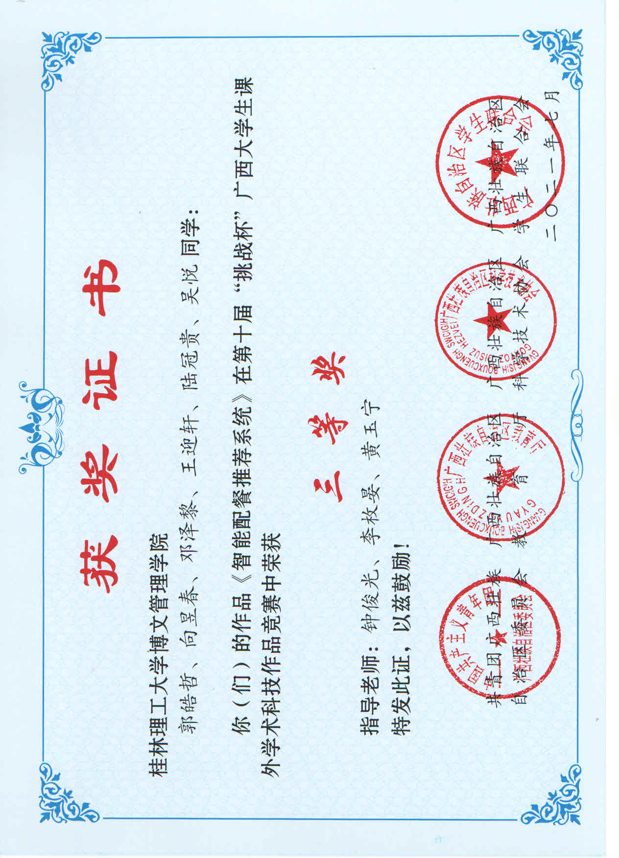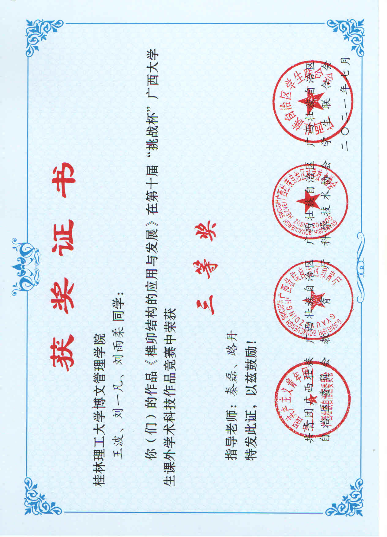 近日,由共青团广西区委、自治区教育厅、自治区科协、广西学生联合会共同主办的第十届“挑战杯”广西大学生课外学术科技作品竞赛结果公布。其中,我校参赛作品荣获二等奖1项,三等奖9项。