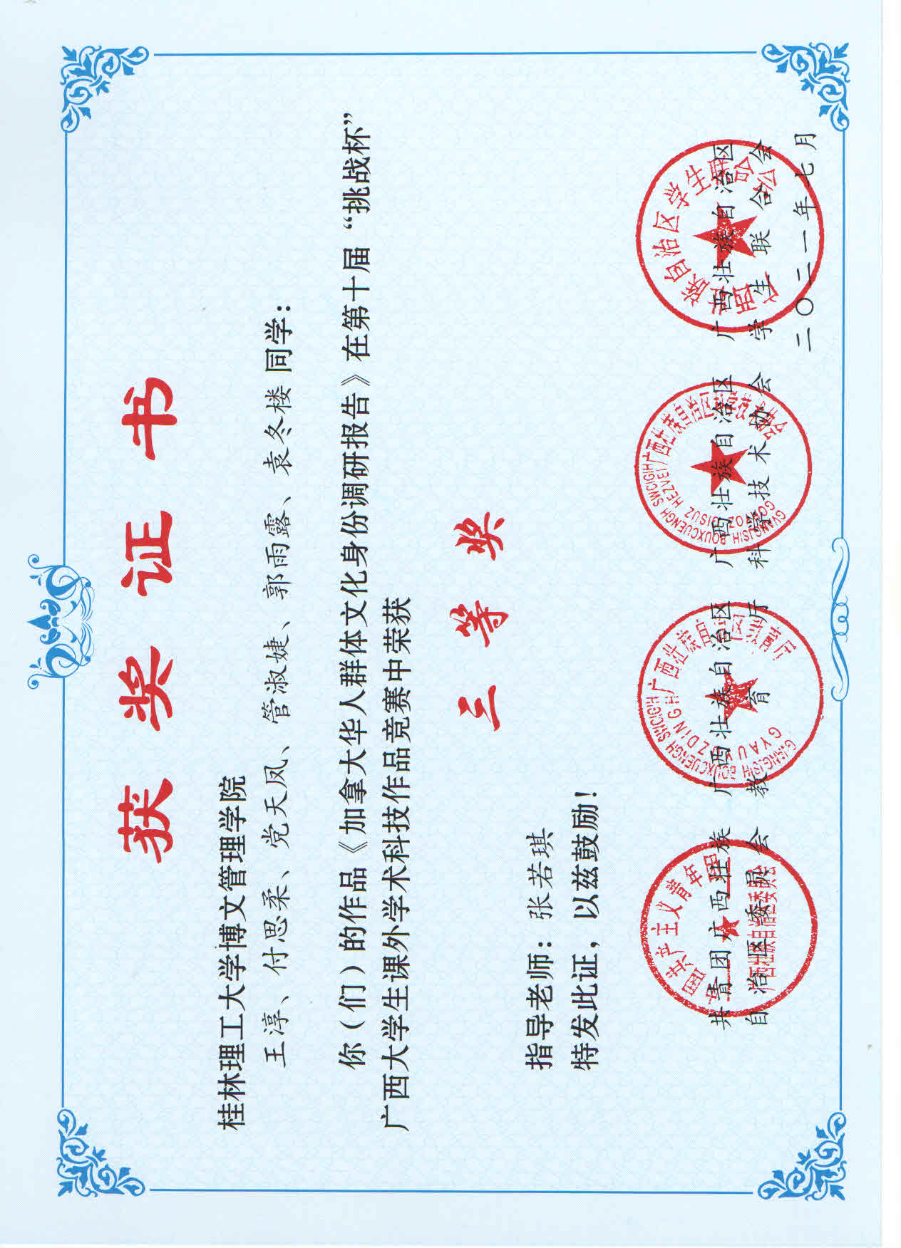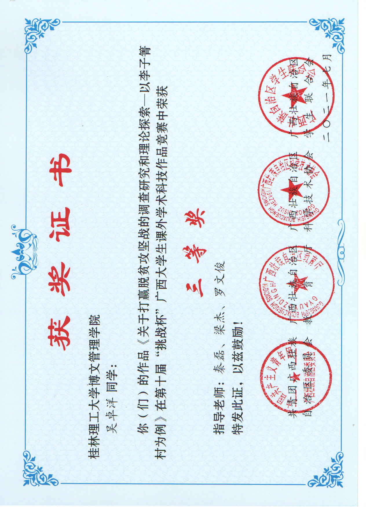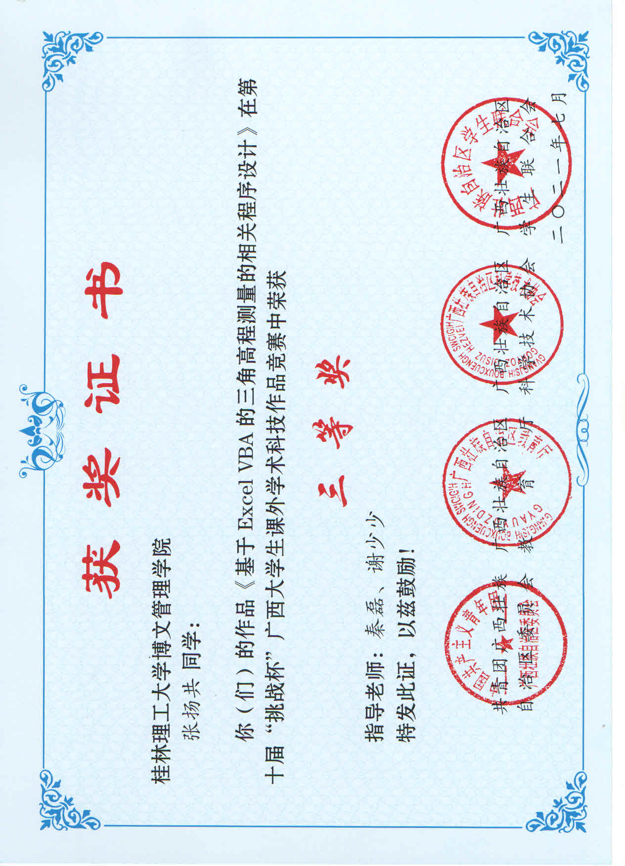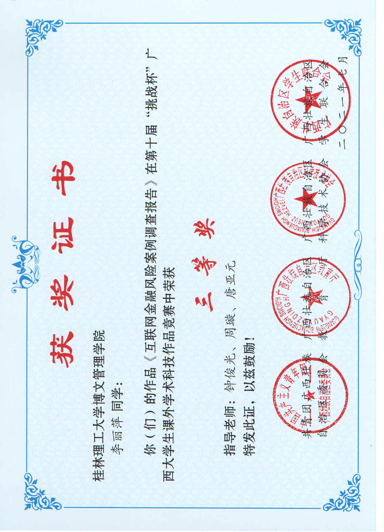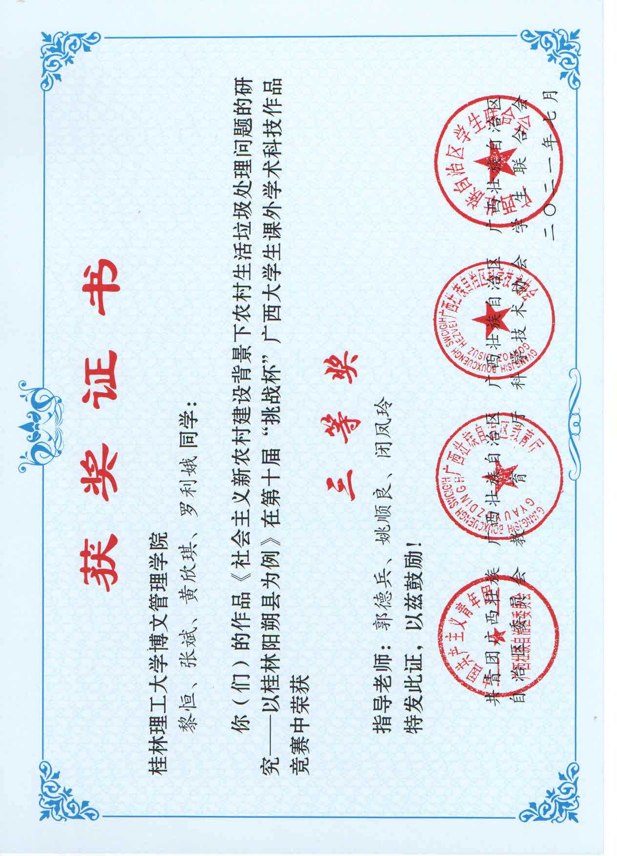 近日,由共青团广西区委、自治区教育厅、自治区科协、广西学生联合会共同主办的第十届“挑战杯”广西大学生课外学术科技作品竞赛结果公布。其中,我校参赛作品荣获二等奖1项,三等奖9项。