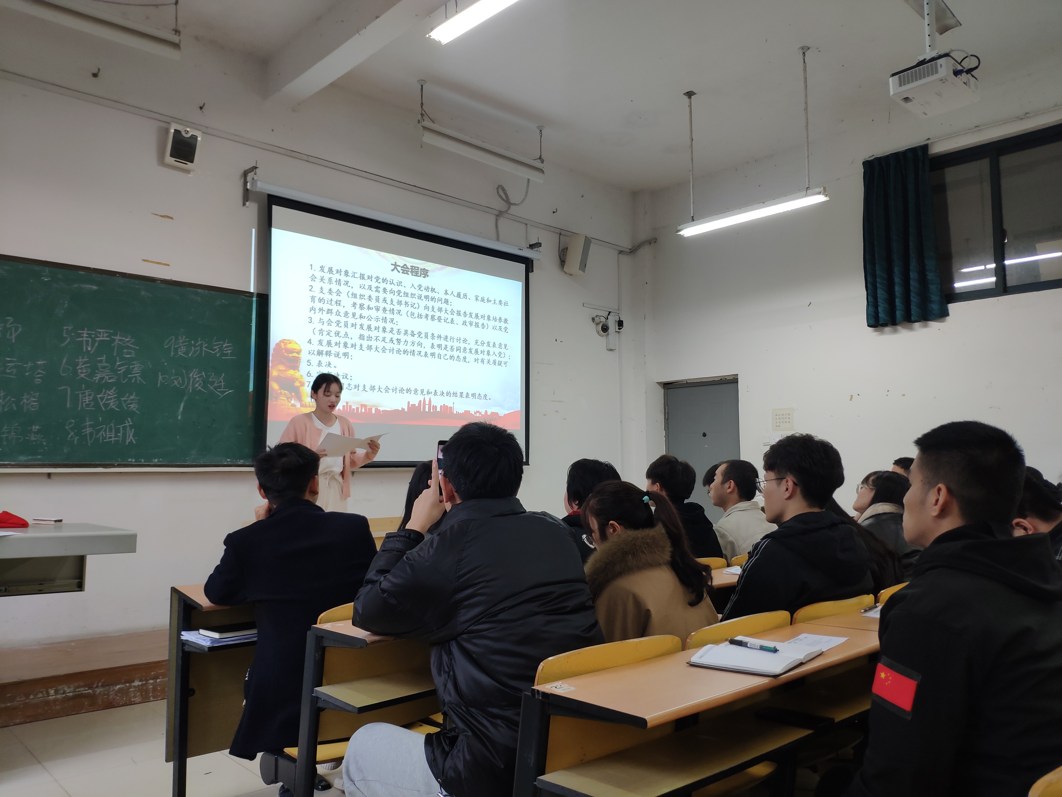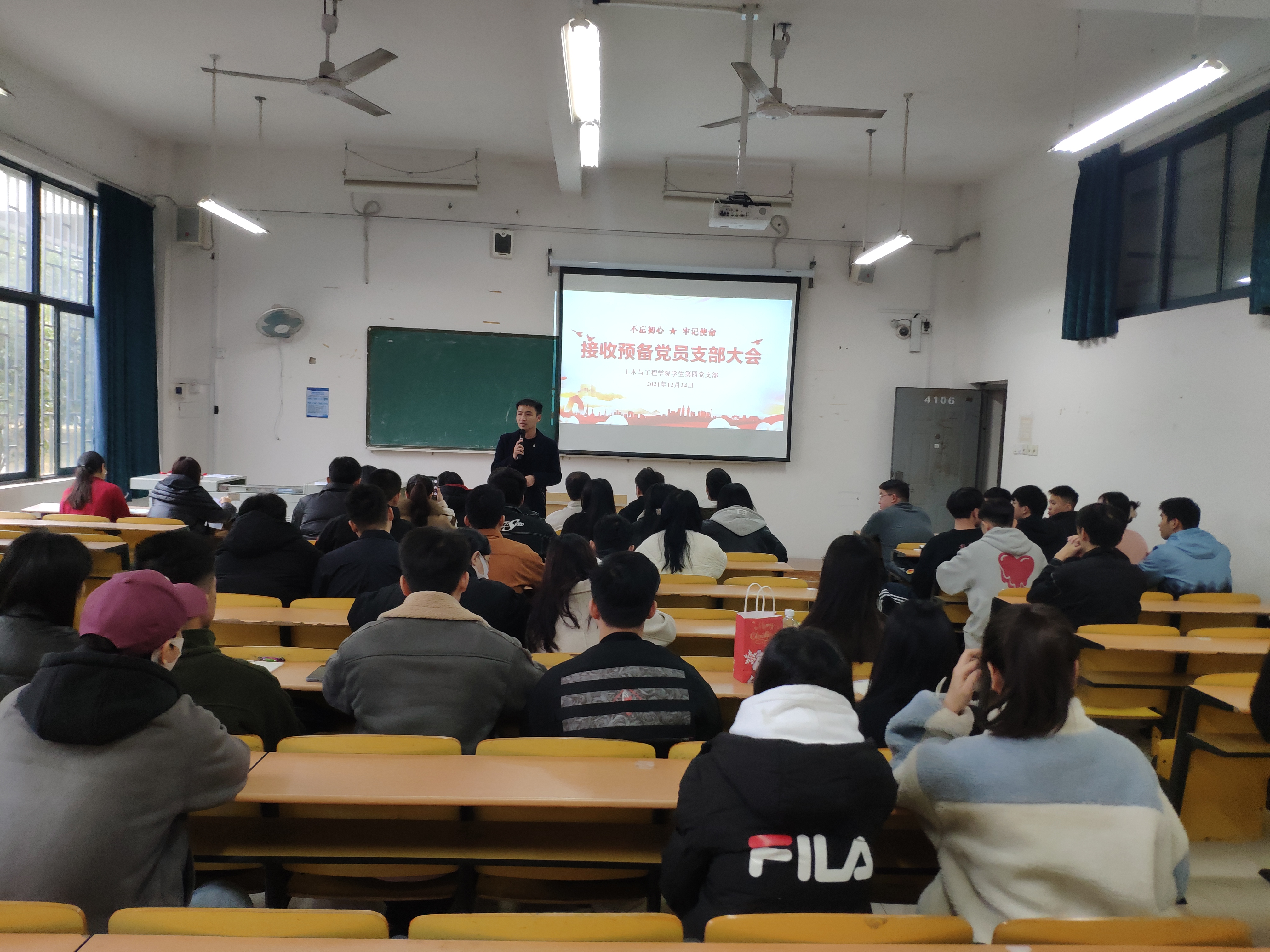 土木与工程学院学生第四党支部于12月24日下午在4106教室召开接收预备党员支部大会。此次会议由支部书记龙舒桦同志主持,本支部共有党员82名,大会应到有表决权的正式党员62名,因事请假7名,实到48名,超过支部有表决权党员的半数以上,可以开会。