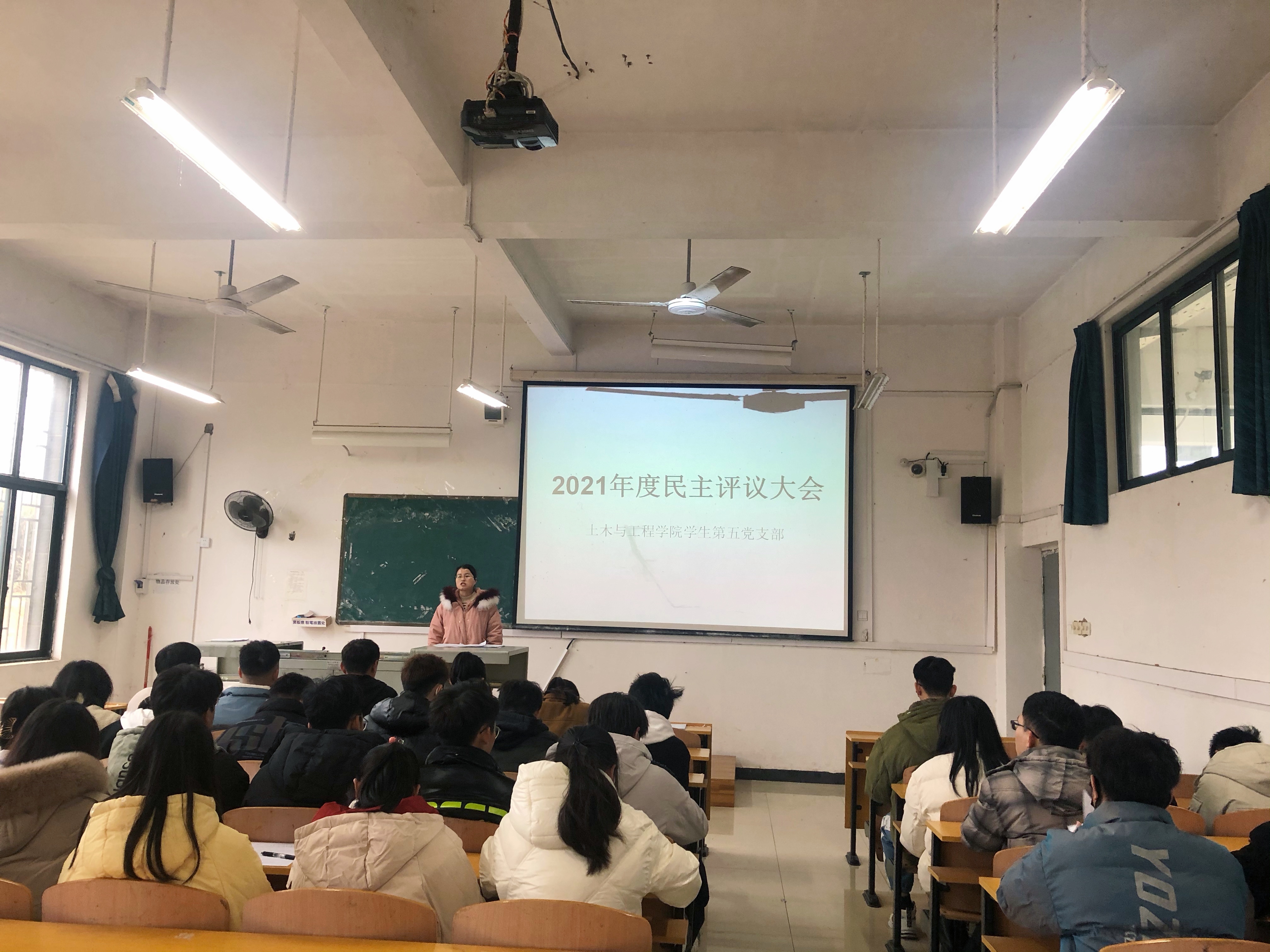 根据学校党委和院党总支的精神,12月30日上午,我院学生第五党支部于四教4126召开2021年度民主评议大会。本次会议由学生第五党支部书记叶琴主持,土木与工程学院学生第五党支部全体党员参加。