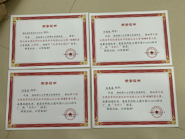 5月19日,“第7届全国高等院校建筑软件技能认证大赛-BIM算量大赛”圆满落幕。经过激烈的比赛,我院从参与团体决赛的241个本科队伍中脱颖而出,喜获本科组全国三等奖,其中,老师被授予“优秀指导教师”称号,万海丽、吴春春、刘奕奕三位同学荣获本科组广西壮族自治区“省前三”排名的优异成绩。