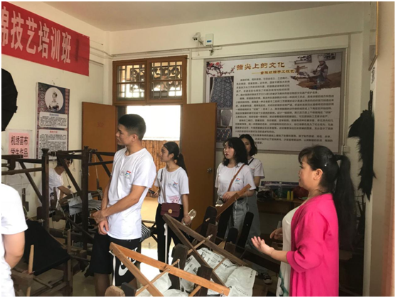 在青少年文化活动中心内,唐老师不但向团队讲解了许多苗锦文化知识,还向分享了许多自己的手工品。队员们了解到虽然苗锦的手工品制作流程及其繁杂,耗时很久,但是呈现出的也是极其绚丽、经久不衰的纹样。唐老师手把手的教我院团队成员使用苗锦织布机,让队员们亲身体验苗锦技艺。