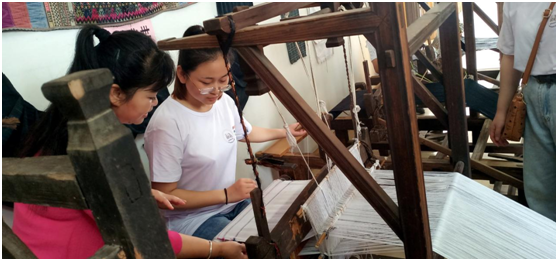 团队成员体验苗锦织布机技艺
