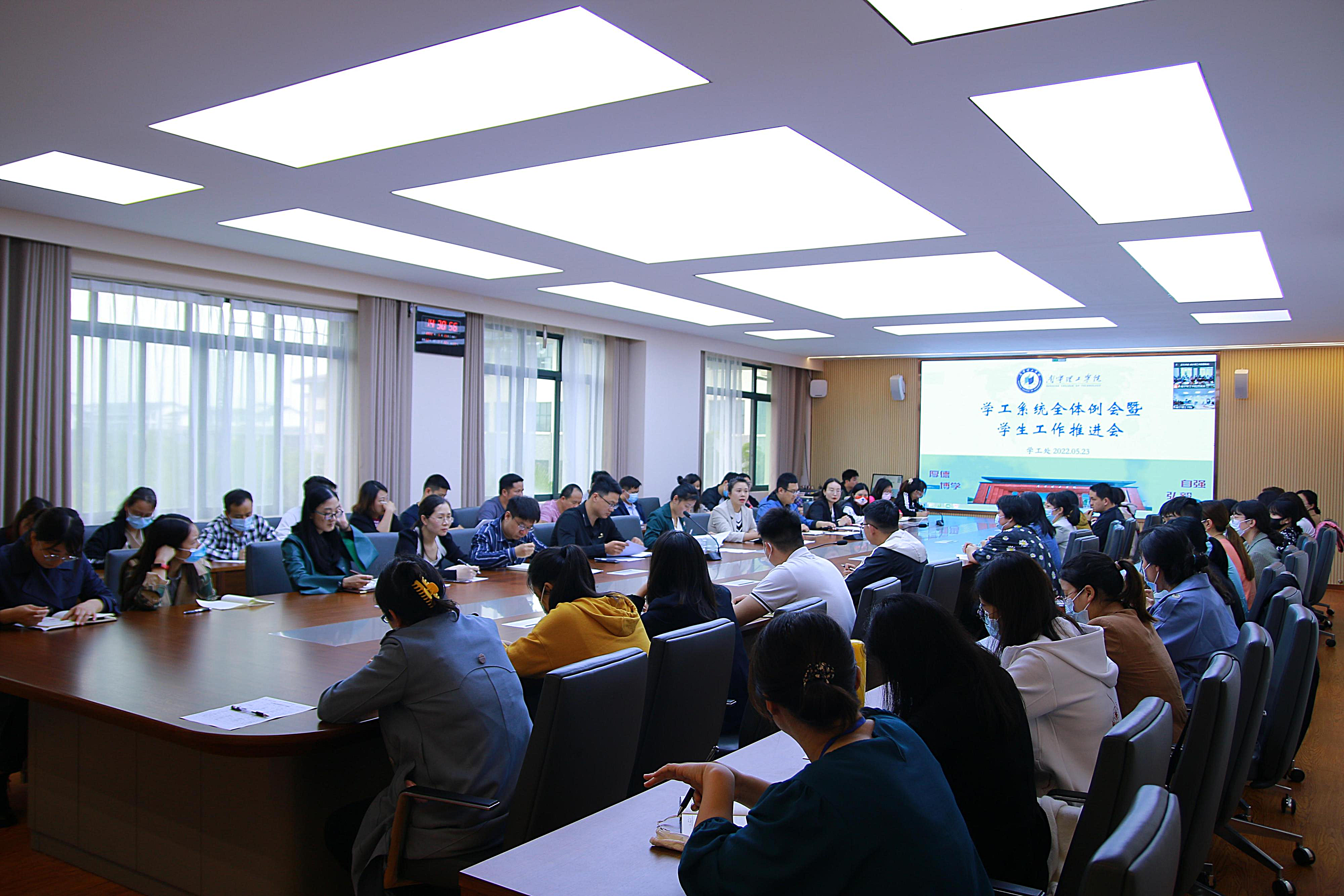 5月23日下午,学工处在3324会议室组织召开学工系统全体例会暨学生工作推进会,学校党委副书记邓雪梅、学工处处长李枚晏、学生事务部主任孙宝会、团委书记朱新辉出席会议,各学院学生工作负责人、学工处(团委)各科室、全体辅导员等参加会议。东盟校区线上一并参会。