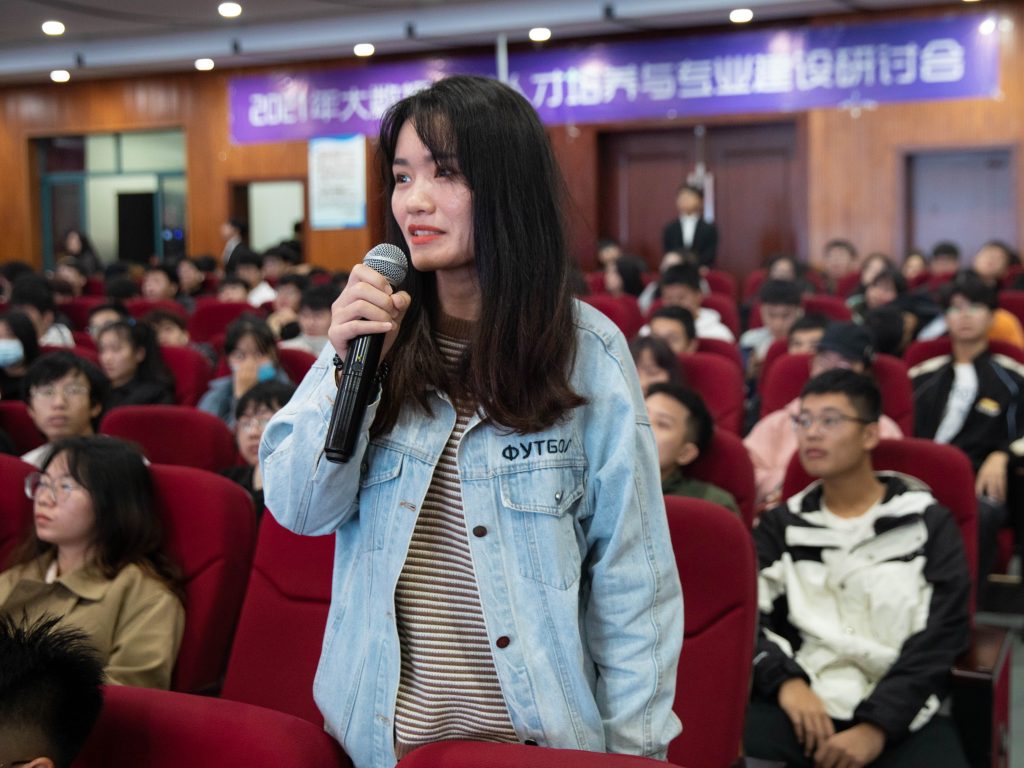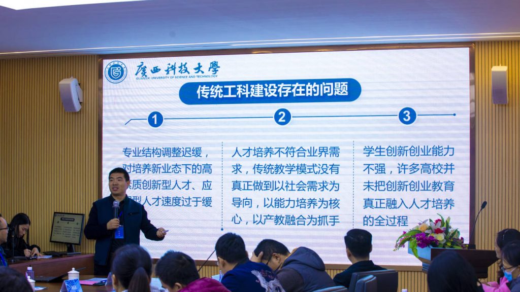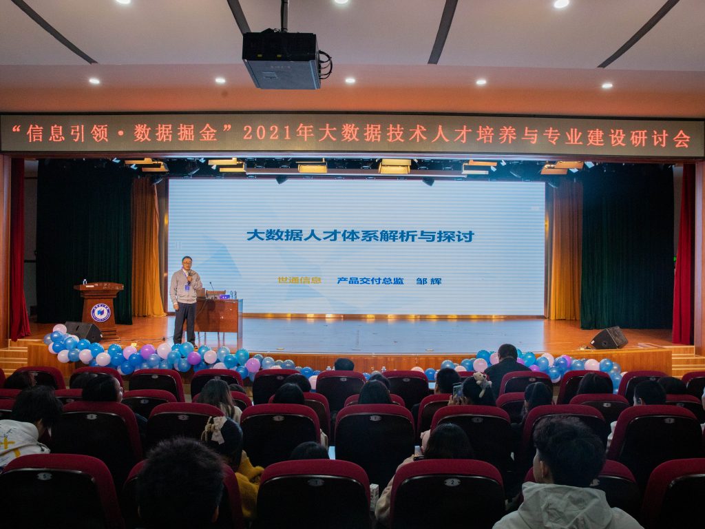 深圳市艾特家科技集团副总经理刘晓涛、广西旅游数据中心主任莫明建、广西科技大学启迪数字学院副院长王萌分别作了《大数据技术体系解析与探讨》、《大数据平台建设与运行管理》、《新工科建设的内涵与实践》主题的分享报告。随后我校信工学院院长许永敏主持了《大数据技术“双一流”建设研讨会》。最后,深圳市世通信息技术有限公司人才交付经理邹辉为信工学院的450多名学生作了《大数据应用场景解析》主题的讲座。