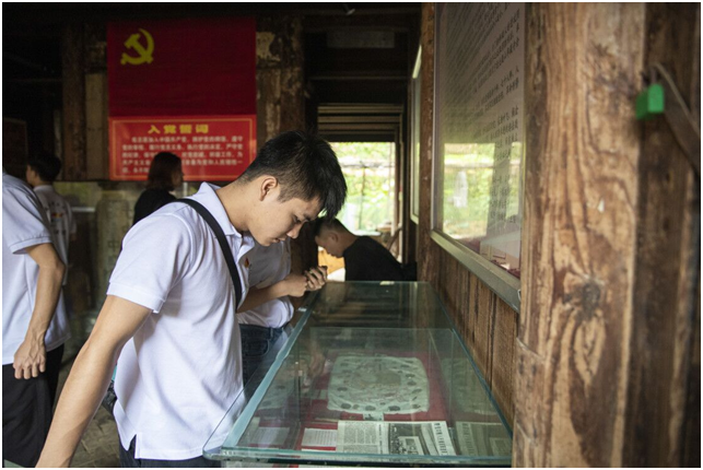 我校“青春力量进柘荣”实践团队成员在柘荣县团委书记朱乃津的带领下,来到了柘荣第一个党小组会址,成员们踏入会址的大门后,便立刻被充满红色气息的场景所吸引,古老的横梁承载着革命时期的辉煌历史,泛黄的入党誓词饱含着革命人士对革命的信心与决心。从朱书记的讲解中,队员们了解了曾志、林爱等老一辈爱国人士为革命而奋斗一生的历程,并身临其境地体会到了在战火纷飞的年代,革命先驱们抛头颅洒热血的爱国主义精神。