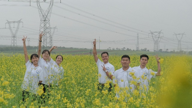 团队成员一同观赏油菜花地