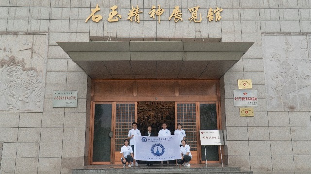 实践团队和讲解员一同在右玉精神展览馆前合影