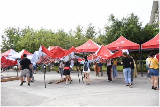 上午的培训会后,我院立即开始投入到各项迎新准备工作以及建设学院新生接待点的搭建工作中。我院19级共设环境设计、建筑学、学前教育、产品设计、广告学、视觉传达六个专业,为此我院专门为每个专业都设置对应的信息录入服务站。志愿者们引导新生报到,从缴纳学费、领军训服装到宿舍安排等各项流程,一对一全程跟随,不仅表明了我院对迎新工作的重视,更体现出了“八方聚,建设迎”的主题精神。志愿者们个个积极投入接待新生工作、明确各自岗位职责,为我院迎新活动的顺利展开奠定了基础。另一方面,我院全体辅导员也积极参与到迎新活动中,为各位19级的同学和家长们答疑解惑、及时处理各项问题。