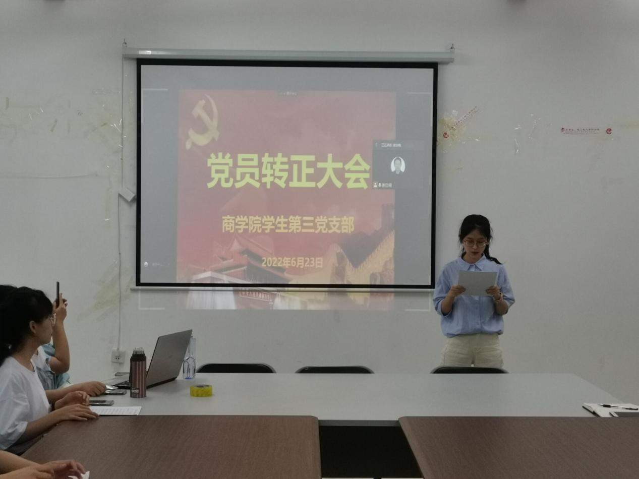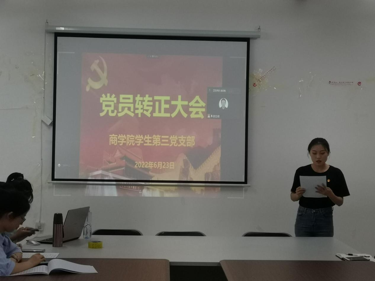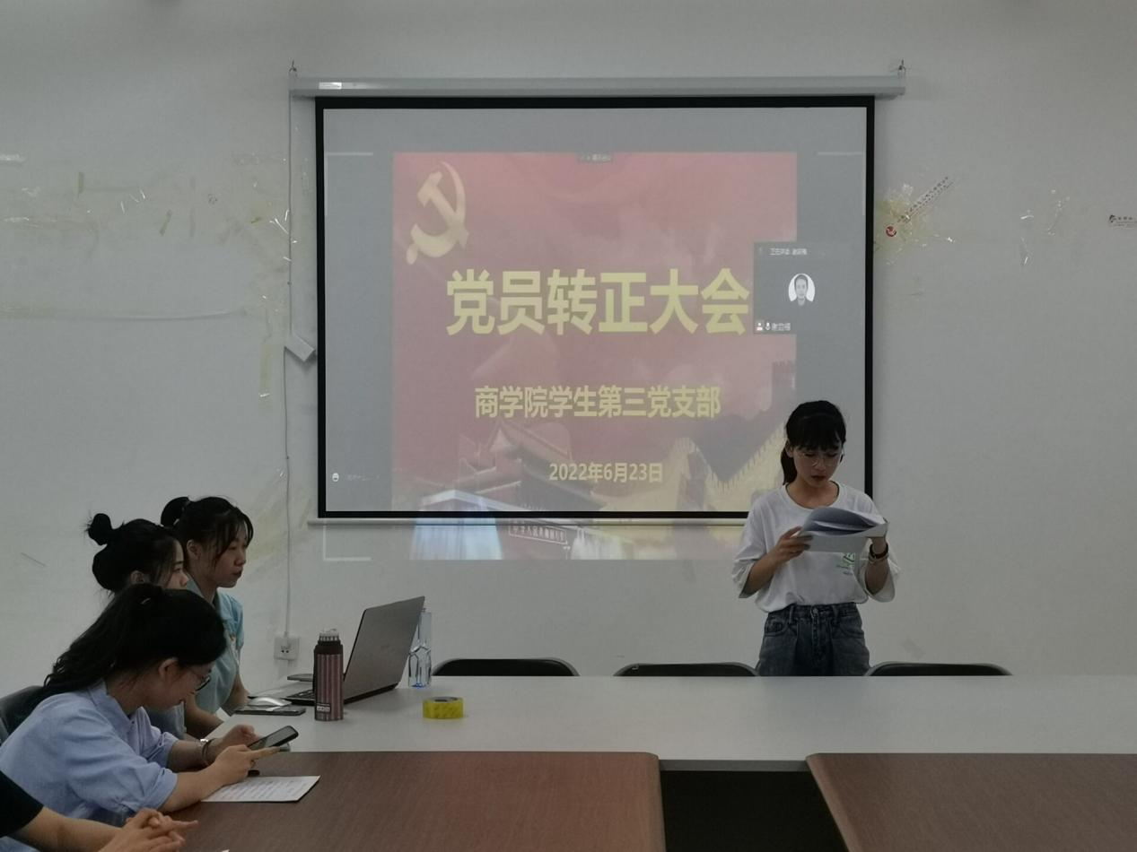 2022年6月23日,商学院学生第三党支部预备党员转正大会在1410会议室举行。本次预备党员转正会议由学生第三党支部书记谢启禧主持,本支部全体党员和预备党员参与本次会议。