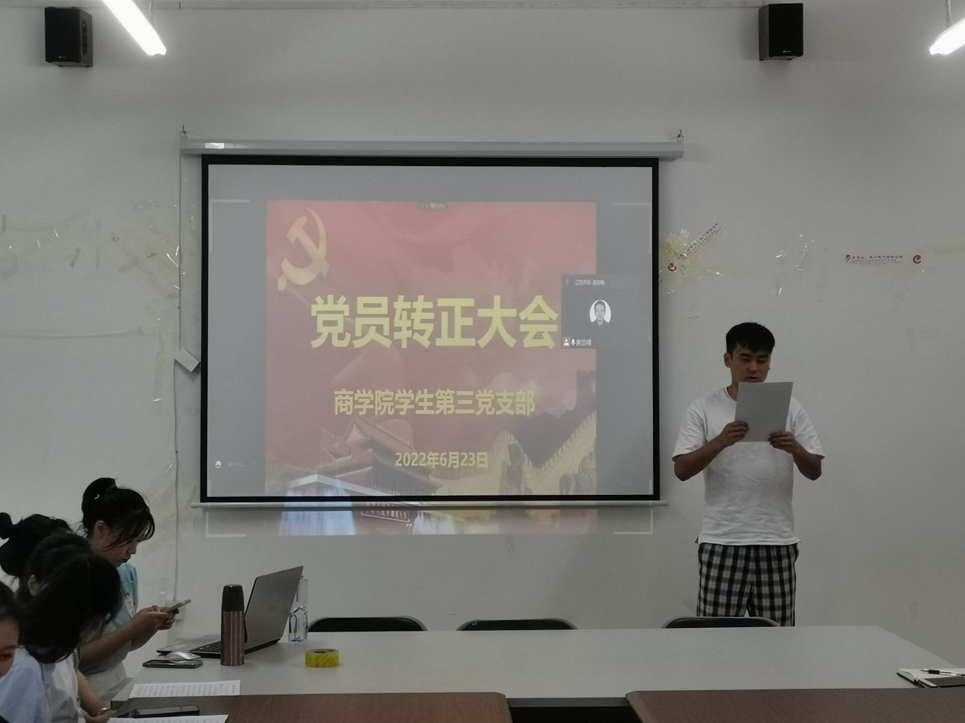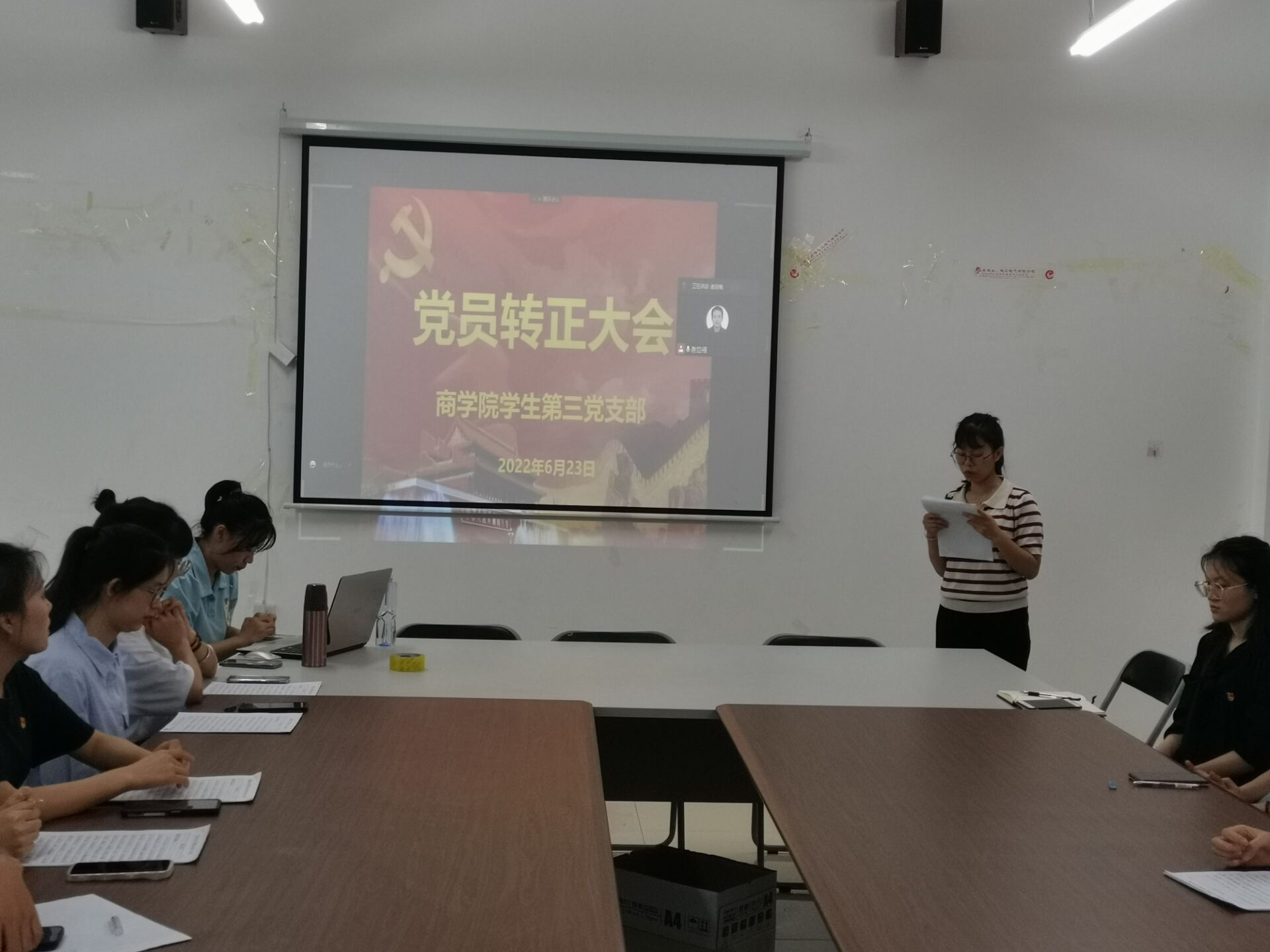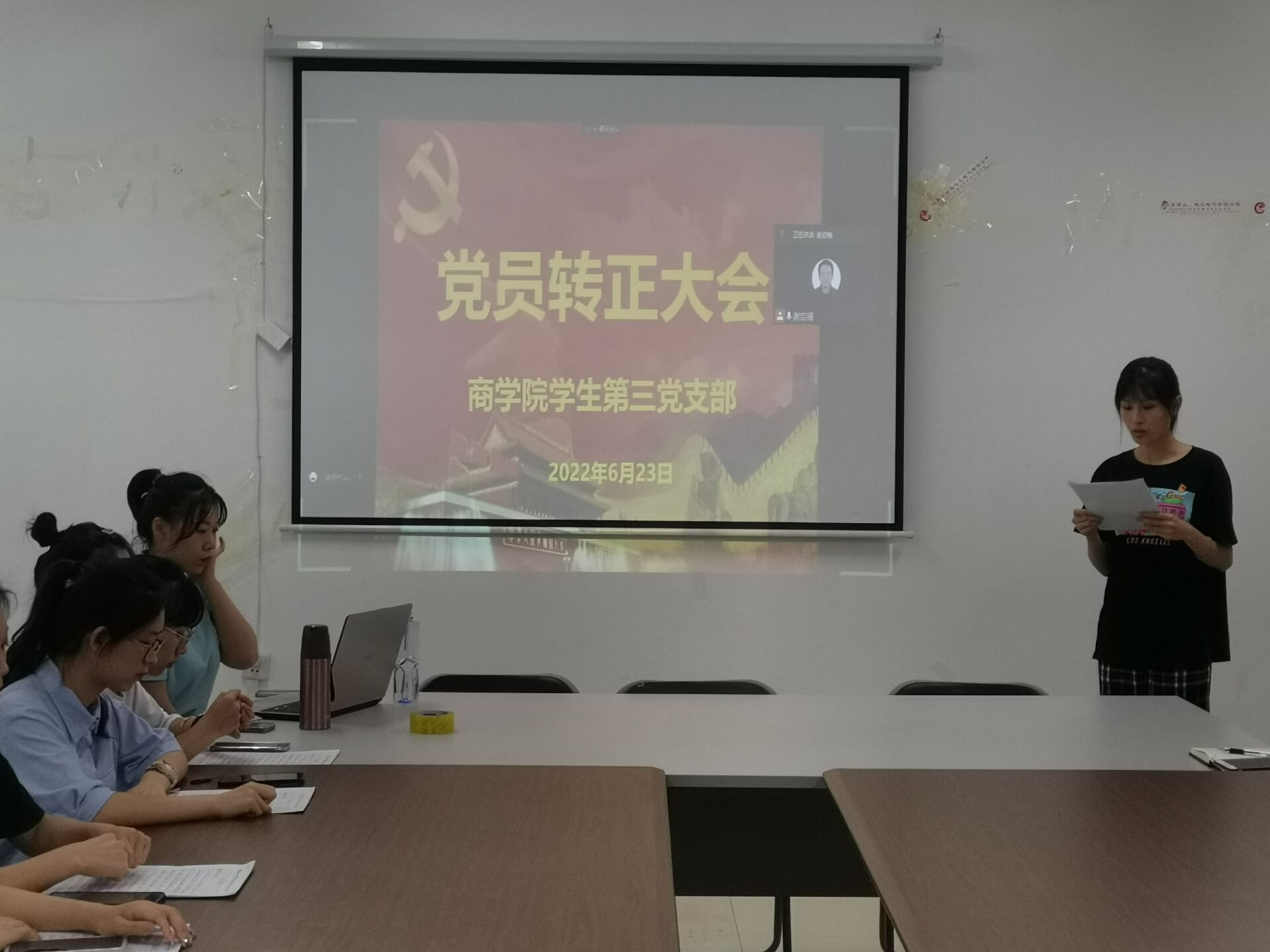 2022年6月23日,商学院学生第三党支部预备党员转正大会在1410会议室举行。本次预备党员转正会议由学生第三党支部书记谢启禧主持,本支部全体党员和预备党员参与本次会议。