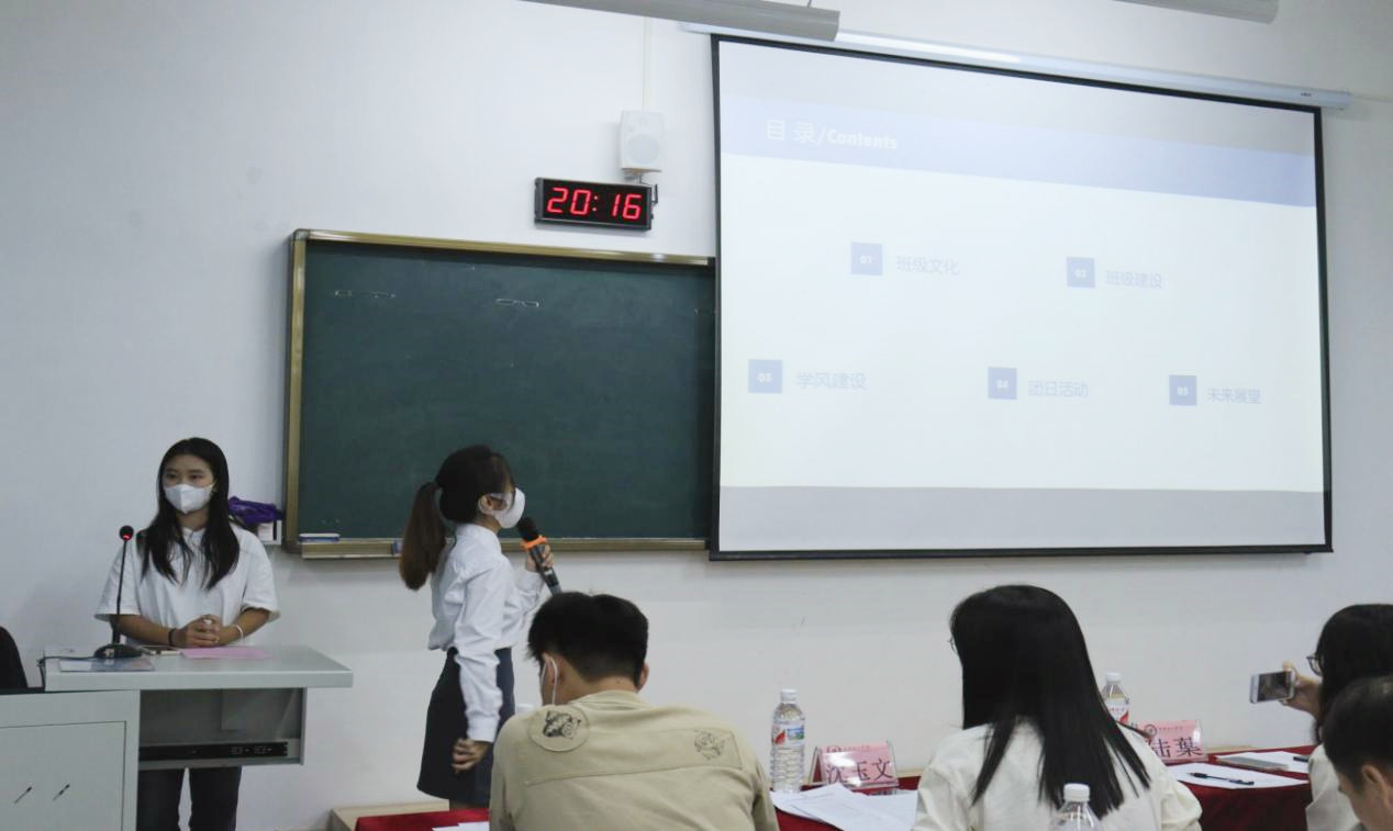 评选开始,全体起立,奏唱团歌。紧接着,主持人宣布评分细则,各班级、团支部代表依次通过PPT、视频,演讲等多种形式进行现场汇报,分别围绕思想建设、学风建设、志愿活动、日常管理、班级(团支部)特色等方面展开了丰富多彩的汇报演示。
