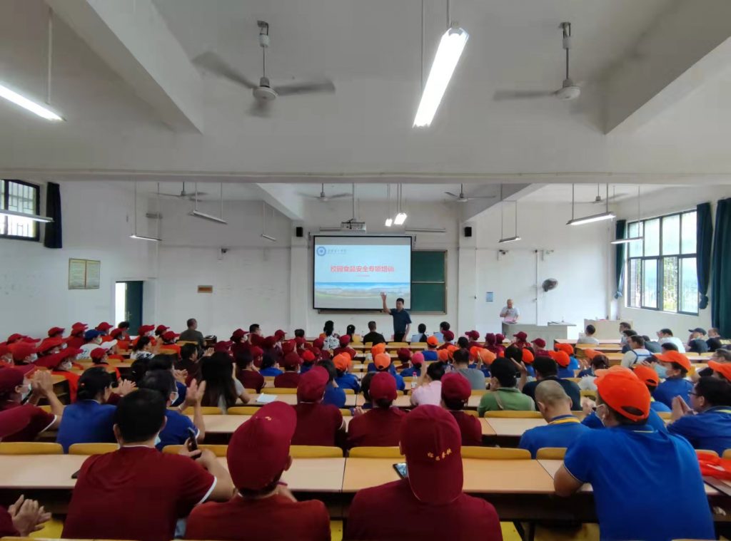 为切实做好学校食品安全工作,后勤保卫处于9月23日下午组织各餐饮公司管理人员、食堂档口工作人员、商业街食品经营户在4栋教学楼4103教室召开校园食品安全专项培训会。会议由后勤保卫处饮食服务中心主任满文钊主持,特邀雁山区市场监管局副局长夏桂春、餐饮股股长郭佳伟等食品安全监管工作人员到会指导培训。后勤保卫处处长钟木生、餐饮商业干事陈明慧参加会议。
