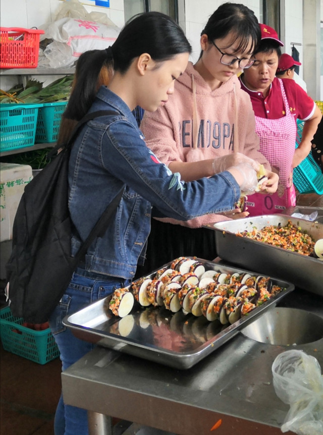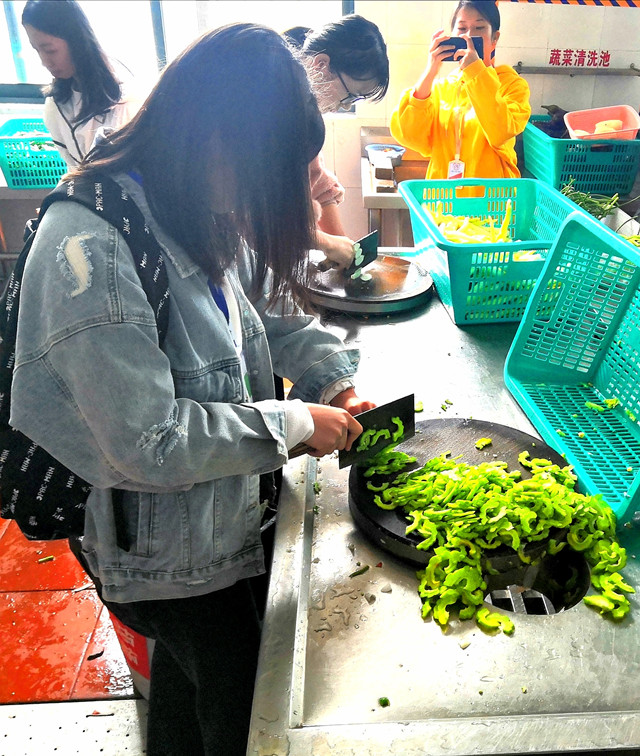 此次活动通过走访的方式,由主任带队,在伙管委工作成员的陪同下,首先对一食堂后厨进行了探秘。食堂主管详细地向同学们讲解了食堂从采购、验收、初加工、切配、烹饪、暂存直到饭菜售卖,紧密相连的7道工序。为了把一切不安全因素消灭在萌芽状态,每一道工序都有具体的责任人。食堂工作人员在每一道工序前筑起了一条看得见的安全防线。接着,两位食堂负责人带领同学们亲手体验切、炒、拌等制作工序,丰富多样的菜品,让同学们忙得不亦乐乎,尽情感受着烹饪所带来的乐趣。