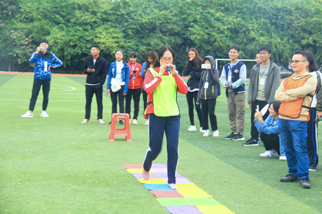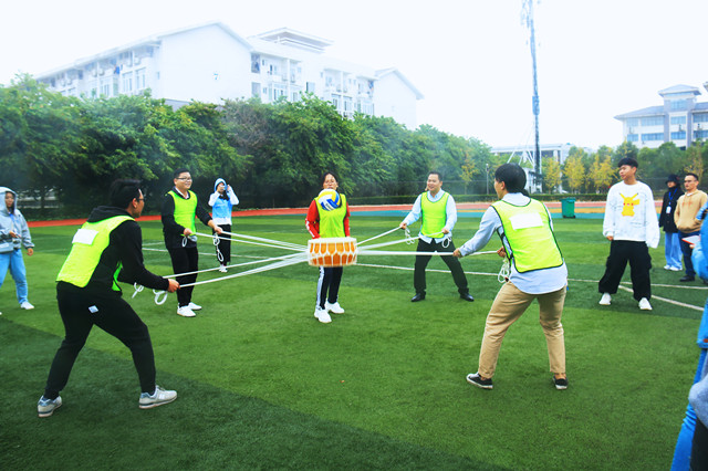 活动开始前,由工作人员介绍素质拓展项目及规则,所有辅导员以团队的形式分为五个组,身穿不同颜色的马甲来进行素质拓展项目,项目包括“改革开放”、“邓小平南巡”、“北京奥运会”、“欢庆70周年”、“撕名牌”五个时代主题。场内的辅导员看到一个个主题,仿佛置身于中国的历史图画之中。时代飞腾,岁月如梭,新中国成立70年的沟沟壑壑被今日的壮丽江山和辉煌成就所填满,更加让辅导员牢记此次活动的主题。活动过程中,各位辅导员大展身手,在队伍里大显神通,蓄势待发,既要“攻”也要“守”,每一次狭路相逢都是一场激烈的竞争。所有辅导员都干劲十足,互帮互助的团队精神在各项目中得到了充分体现。