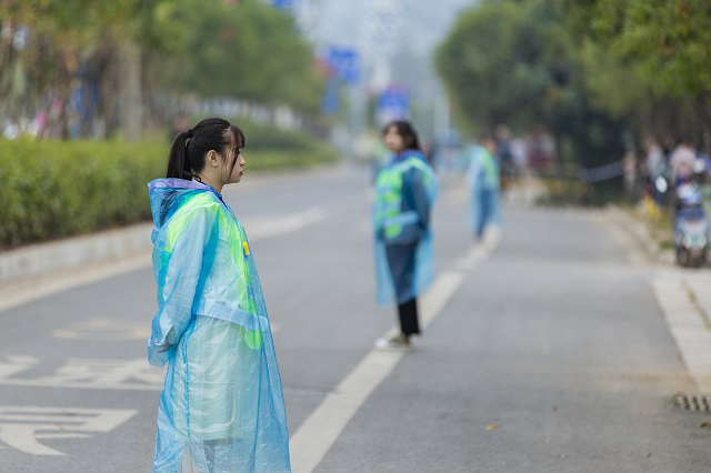 图为我校学生志愿者为参赛者执勤场景