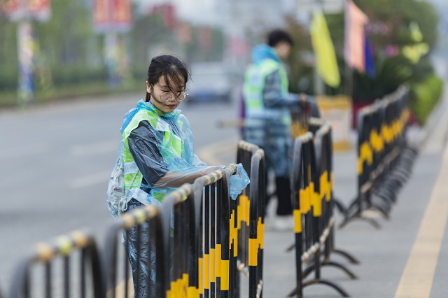 图为我校学生志愿者为现场道路维护场景