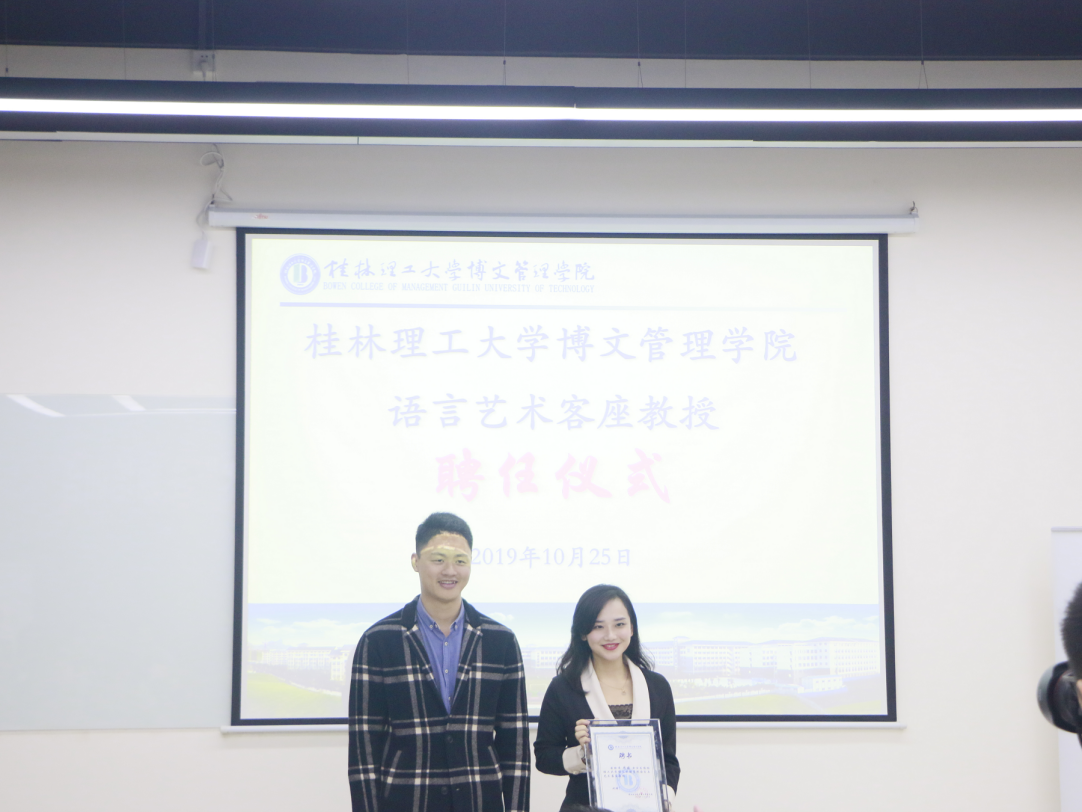 讲座开始前,先进行聘任仪式。由学校学工处副处长、团委副书记为广西广播电视台主持人周媛颁发聘书,聘请周媛为桂林理工大学博文管理学院语言与艺术客座教授。
