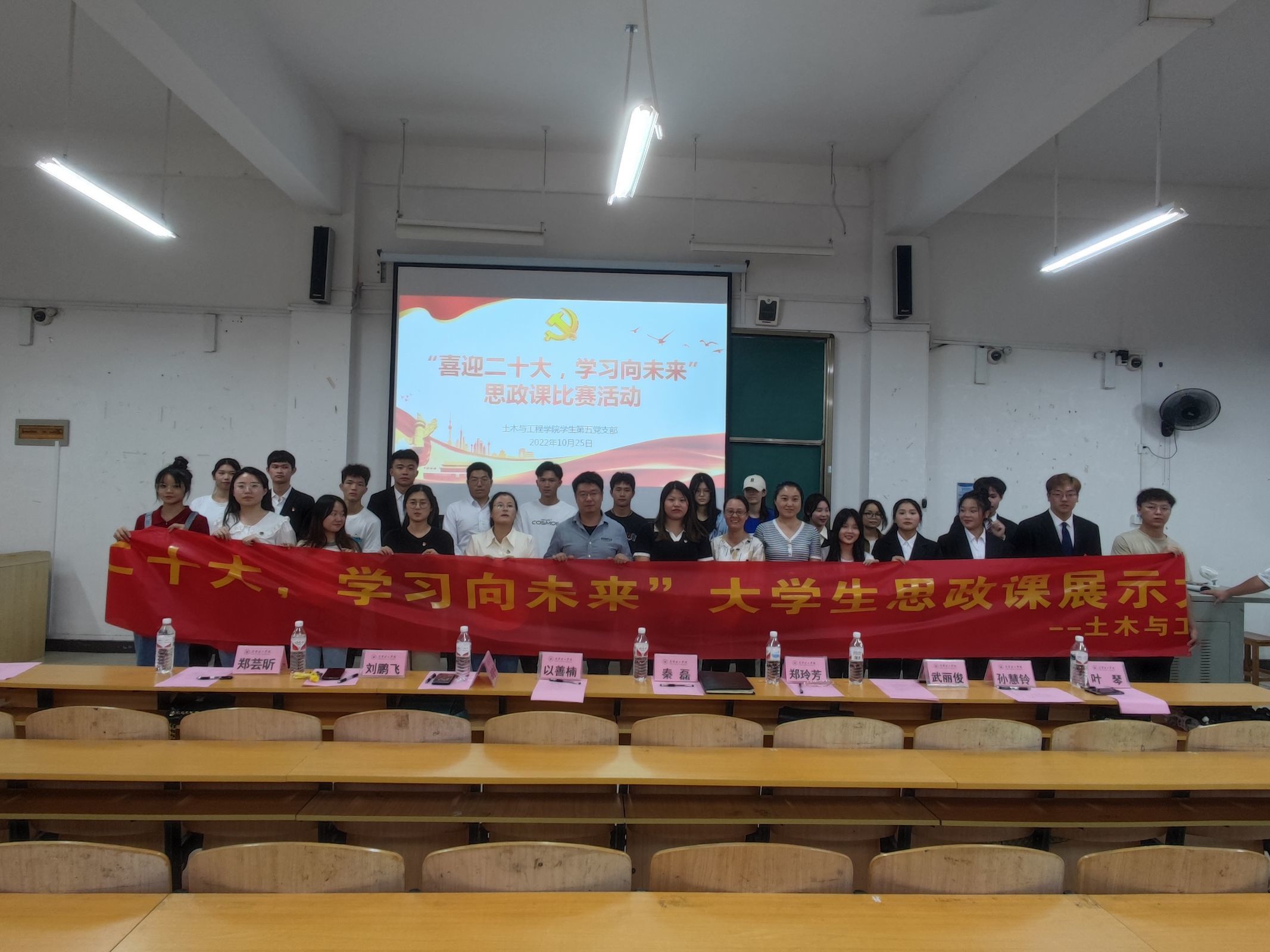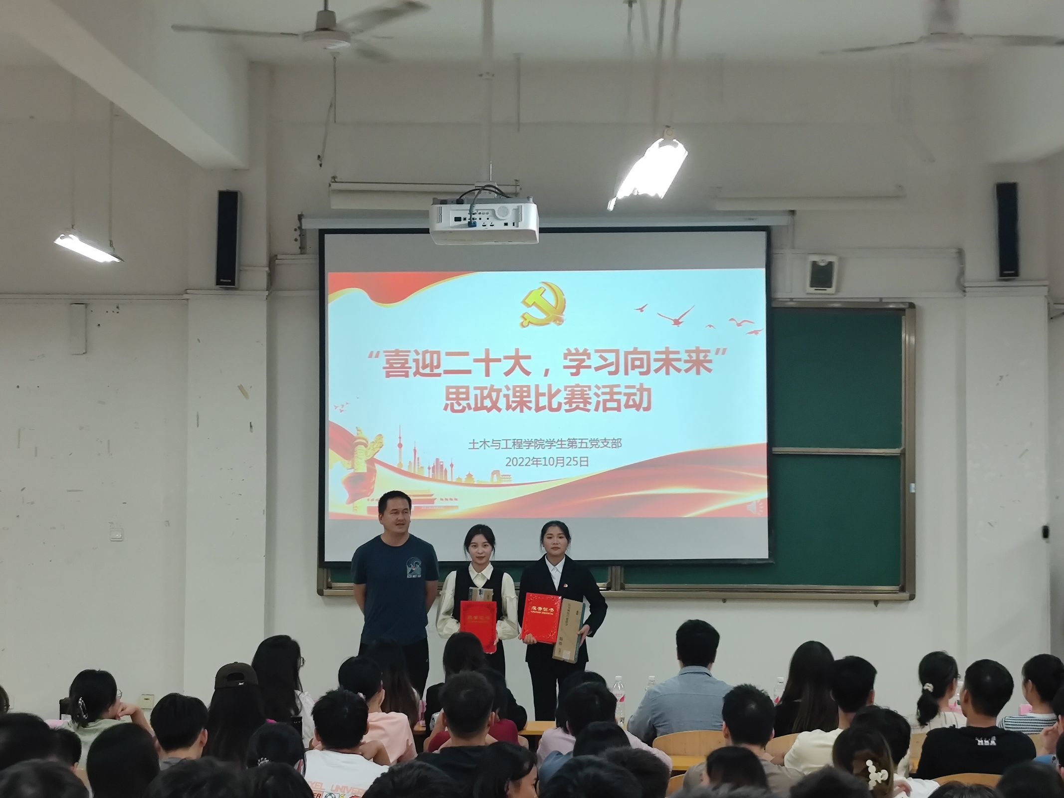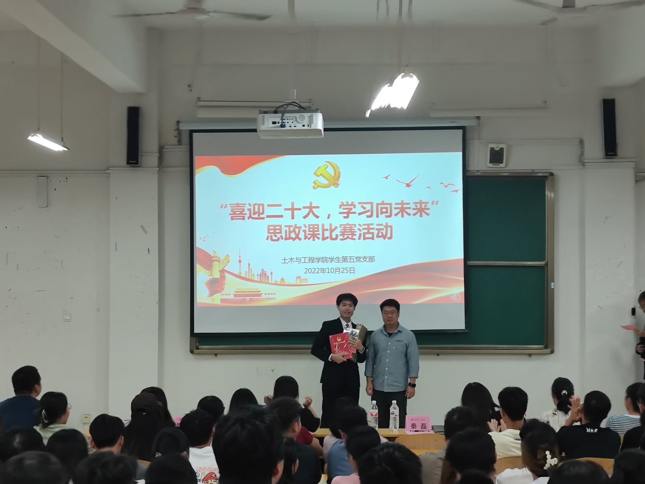 为了深入学习贯彻党的十九大、二十大和十九届历次全会精神,深入落实习近平总书记关于青年工作的重要思想,聚焦抓好党的事业后继有人这个根本大计,2022年10月25日,在4202教室,土木与工程学院学生第五党支部举办“喜迎二十大,学习向未来”大学生思政课决赛活动。学院党总支书记秦磊出席活动,担任本次比赛评委的是学院各学生支部书记。